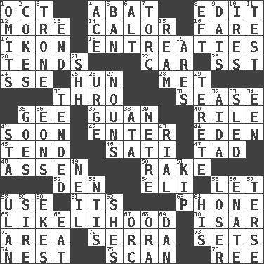 ACROSS 1. Sep. follower 4. Blind as ____ 8. Prepare for publication 12. Greater amount 14. Bodily heat indicating an inflammation 16. Conductor's collection 17. Visual representation of an object 18. Pleas 20. Looks after 22. 4-wheeled motor vehicle 23. Fast jet (abbr.) 24. Compass dir. 25. Attila the _ 28. Was introduced to 30. Through, poetically 31. Gospel singer Marvin 35. Turn to the right 37. Island territory of the United States 40. Cause heat under the collar 41. Within a short period 42. Keyboard key 44. Genesis locale 45. Be inclined (to) 46. Suttee (variant) 47. Small amount or degree 48. NE Netherlands city 50. Immoral or dissolute person 52. Lair 54. Biblical high priest 55. Allow 58. Purpose 61. It is 63. Give a jingle 65. Odds 70. Austrian river, tributary to the Danube 71. Type of rug 72. Spanish missionary in California 73. Puts into a specified state 74. A home for chicks 75. Glance over 76. To riddle DOWN 1. Leaves out 2. Popular sodas 3. Marketplace scale 4. Adept person 5. Forbid 6. The first octave above the treble staff 7. Torque (variant) 8. Bank Draft (abbr.) 9. Raised platform 10. Angers 11. Trial 13. Conclusion 15. 480, 500 or 516 sheets of paper 19. Ancient Greek god of war 21. Quiet! 26. Goad 27. Parts of speech 29. Cylindrical with tapered ends 30. Watched over 32. Opera by Verdi 33. Downhill vehicle 34. Car or cant ending 35. Moves 36. Immeasurably long periods of time 38. _ moment's notice (2 wds.) 39. Distance measurement (Brit.) 41. R.R. building 43. Monetary unit of Yemen 49. Famous astronaut Armstrong 51. Monetary unit of Laos 53. Nuclear Threat Initiatives 55. Failure 56. Maternal 57. Laconic 58. ____ Bator 59. Beget 60. Supplements with great effort 62. "______ My Girl" (Turtles hit) 64. Part of HMS, perhaps 66. Ingest 67. The grampus (Milton) 68. Mouth or opening 69. One of the 12 tribes of Israel