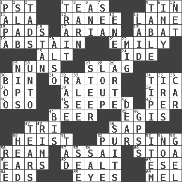 ACROSS 1. Pacific Standard Time (abbr.) 4. Afternoon social gatherings 8. Shallow baking pan 11. Insect wing 12. The wife of a rajah (variant) 14. Unable to walk 15. Groovy apts. 17. Believer in; advocate of (suffix) 18. Blind as ____ 19. Refrain by choice 21. Poet Dickinson 23. The first octave above the treble staff 24. Binary compound 25. Religious women 27. Volcanic refuse 30. Storage container 31. Speaker 34. Nervous spasm 37. Elect 38. Eskimo relative 39. Lyricist Gershwin 40. Bear (Spanish) 41. Oozed 43. For each 44. Fermented drink made from hops 45. The front part of a cuirass 47. Three (prefix) 49. Plant excrement 50. Robbery 52. Puckering 56. 480, 500 or 516 sheets of paper 57. Slender Brazilian palm 60. Portico 61. Hearing organs 62. Started a card game 63. Compass dir. 64. Begley and Asner 65. Sight organs 66. Cartoonist voice _ Blanc DOWN 1. Dad 2. Broad, flat, thick piece 3. Small boys 4. Distinguishing feature 5. Merit 6. Black tropical American cuckoo 7. Ocean 8. Eating place 9. "If ____ say so..." 10. Fish or hair follower 13. Compass dir. 14. Put down 16. Comedian Laurel of Laurel & Hardy 20. In addition 22. Russian fighter aircraft 25. Cuts off 26. To (old English) 27. Bull 28. Central Nebraska county 29. Johnson of "Laugh-In" 30. Sometimes accompanies a hiss 32. Raze (variant) 33. Toward shelter 34. Native american tent (variation) 35. Angers 36. 4-wheeled motor vehicle 42. Letter starter 44. Twice 46. Global Positioning Systems (abbr.) 47. Lacerates 48. Basketball hoops 49. Sets or collections 50. Froth on beer 51. Small amount or degree 52. Light colored 53. A distinct part 54. Characteristic smell of wine 55. Highlander 56. To separate or throw off 58. Observe 59. Declare