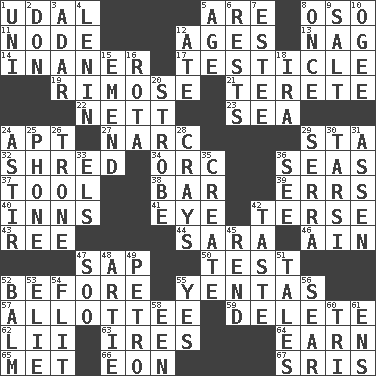 ACROSS 1. Allodial 5. "We ___ not amused" (Victoria) 8. Bear (Spanish) 11. Connecting point 12. Eons 13. Tired old horse 14. More empty; more void 17. A testis 19. Full of chinks, cracks, or crevices 21. Cigar-shaped 22. Remaining after all deductions 23. Ocean 24. Fitting 27. Drug cop 29. R.R. building 32. Fragment 34. The grampus (Milton) 36. Oceans 37. Utensil 38. Tavern 39. Blunders 40. Restaurants 41. Sight organ 42. Laconic 43. To riddle 44. "Two Mules for Sister ____" 46. The 18th letter of the Arabic alphabet 47. Plant excrement 50. Trial 52. Prior to 55. Gossips 57. One to whom something is allotted 59. Keyboard key 62. Cards in a Roman deck? 63. Angers 64. Merit 65. Was introduced to 66. Age 67. Indian titles of respect DOWN 1. Corn or form start 2. Spanish title 3. The sixth month of the Jewish calendar 4. Soviet premier 1918-24 5. Grow older 6. Musical pauses 7. First name in cosmetics 8. At one time in the past 9. Table seasoning 10. Double curve, resembling the letter S 12. Had dinner 15. Make improvements or corrections to 16. Round or rotation of duties 18. Retirement account (abbr.) 20. Disco prop 24. Moving or stirring 25. Give a jingle 26. Marketplace scale 28. Trading vessels 29. Father Junipero _ 30. Tarsus (plural) 31. NE Netherlands city 33. Raised railways 35. Cause to be 36. Observe 42. Clothes sense 45. Tear apart 47. "Barney Miller" actor Jack 48. Nick name for Arthur 49. Stone: prefix 51. Stories 52. Lip ointment 53. Writer Wiesel 54. Secret move to avoid paying debts 55. It is so 56. Burn superficially 58. Car or cant ending 60. Three (prefix) 61. Followers of ems