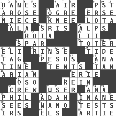 ACROSS 1. Natives or inhabitants of Denmark 6. Wind 9. Pacific Standard Time (abbr.) 12. Came up 13. Legendary monster 14. Celtic language 15. Sibling's daughter 16. Leg joint 17. Globular water bottle used in Asia 18. Chicken ___ king 19. Indian titles of respect 20. High mountains 21. Roll call or roster of names 23. Cards in a Roman deck? 24. Coast Guard woman 25. Carrier 28. Connecticut Ivy Leaguer 30. Wash lightly 34. Event that recurs at intervals 35. Label 36. Mexican monetary units 38. Santa ___, CA 39. Prong on a fork 41. Portable shelters 43. Scottish cap 44. Believer in; advocate of (suffix) 46. 4th largest of the Great Lakes 48. Bear (Spanish) 49. It's straight from the horse's mouth 50. Group working together 51. One who uses or employs something 53. Wet nurse (var.) 56. Silvers or Donahue 57. First of billions? 58. Empty; void 60. Perceives with the eye 61. Billionth: prefix 62. Trials 63. Big collection agency 64. Raised railways 65. Nick name for Arthur DOWN 1. Daniel's nick name 2. Operatic vocal solo 3. Christmas carol 4. Fortification 5. Perceive with the eye 6. Hindu god of fire 7. Angers 8. To sift 9. Conciliate 10. Fast planes 11. Beverage made from leaves 13. Gumbo ingredient 14. American author Paul (1891-1958) 19. Remove all contents or possession from 20. The first octave above the treble staff 22. Boat paddle 24. Seigniories (variant) 26. Pulitzer Prize-winning author Ferber 27. 480, 500 or 516 sheets of paper 28. Singer James 29. Den 31. Fish or hair follower 32. Compass dir. 33. A really long time 37. Navigate 40. Artist's stands 42. Indian title of respect (Mr.) 45. Immediately 47. More lacking in sense or substance 49. San ____ (Riviera town) 50. "Mermaids" star 51. Freehold land 52. Without 54. Vertical spar for supporting sails 55. Against 56. Air pressure measure (abbr.) 57. A saturated hydrocarbon 58. Call ___ day 59. Compass dir.