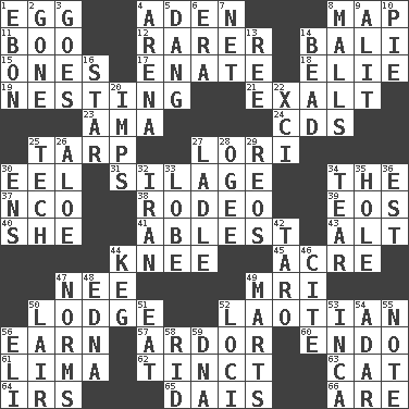 ACROSS 1. Oval reproductive body of a fowl 4. Arabian gulf 8. Atlas unit 11. Surprise greeting 12. More uncommon 14. Indonesian resort city 15. Singles 17. Related on the mother's side 18. Writer Wiesel 19. Snuggling 21. Honor 23. Nanny (var.) 24. Music discs 25. Canvas cover 27. Australian parrot (variant) 30. Snakelike fish 31. Fodder prepared in a silo 34. Definite Article 37. Non-commissioned officer (abbr.) 38. Cowboy competition 39. Greek goddess of the dawn 40. A female animal or person 41. Most capable 43. Keyboard modifier key 44. Leg joint 45. 1/640 square mile 47. Born 49. Medical imaging device (abbr.) 50. Cabin 52. Of or relating to Laos or its people 56. Merit 57. Zeal 60. Inside; within (prefix) 61. Pale green bean 62. Colored lightly or faintly 63. Feline 64. Big collection agency 65. Raised platform 66. "We ___ not amused" (Victoria) DOWN 1. Inky black, to poets 2. Went 3. Leaves 4. Sports stadium 5. Mild oath, euphamism for damn 6. Period 7. Fish or hair follower 8. Promenades 9. Came down and settled, as after flight 10. Sliced dessert 13. To riddle 14. Necklace unit 16. Play the lead 20. Naughty children 22. One more than ninety 25. Technical 26. Medicinal plant 27. Dipping utensil 28. Double curve, resembling the letter S 29. Vintage cars 30. Followers of ems 32. SW Asia republic 33. Ear part 34. Rend 35. Hollow 36. Eastern Standard Time (abbr.) 42. Edible starchy tuberous root 44. Cask 46. Quote 47. Typical standards 48. Pulitzer Prize-winning author Ferber 49. Shops 50. Den 51. Erode 52. Event scenes 53. South American Indian 54. The sixth month of the Jewish calendar 55. Observe 56. Connecticut Ivy Leaguer 58. To free from 59. Heredity factor (abbr.)