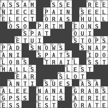 ACROSS 1. Indian state 6. Compass dir. 9. To separate or throw off 12. Sibling's daughter 13. Ache 14. Sew up the eyelids of hawks and falcons 15. Choose 16. Mouths or openings 17. Frame or body of a ship 18. Bear (Spanish) 19. Demure 20. Immeasurably long periods of time 21. Argument over a trivial matter 23. Fr. "Yes" 24. Needle case 25. Closes up, plugs up 28. Groovy apt. 30. Overwhelms 34. Fastener 35. Black tropical American cuckoo 36. Arguments over trivial matters 38. Wedding promise 39. Tennis shots 41. Go after with the intent to catch 43. Fast jet (abbr.) 44. Shopping centers 46. For fear that 48. Hearing organ 49. Narrow, elongated depression 50. Against 51. Institutes legal proceedings 53. White ___ sheet 56. Toward shelter 57. Grandmother 58. Seizes 60. Global Positioning Systems (abbr.) 61. The front part of a cuirass 62. Nest on high 63. Curvy letter 64. Eastern Standard Time (abbr.) 65. Speak pompously DOWN 1. One (Scot) 2. Grain storage tower 3. Observes 4. Buttonhole 5. Was introduced to 6. Indian skirt 7. Thailand, formerly 8. Followers of ems 9. One who advocates reunion 10. Snakelike fish 11. Pipe bend 13. Sweet dark-red dessert wine 14. Yells 19. Aches 20. Greek goddess of the dawn 22. Fluid product of inflammation 24. The property of being fit to eat 26. Writing tablets 27. Blemish 28. Inside of hand 29. Small Philippine buffalo 31. Elect 32. Armed conflict 33. R.R. building 37. Beverly of Met fame 40. Chalkboards 42. Lion 45. Indian title of respect (Mr.) 47. A viewer who gazes fixedly 49. Oceans 50. High mountains 51. Sinks 52. A single undivided whole 54. "Two Mules for Sister ____" 55. "This won't hurt ____!" 56. Personal question 57. Born 58. E Mali city 59. Perceive with the eye