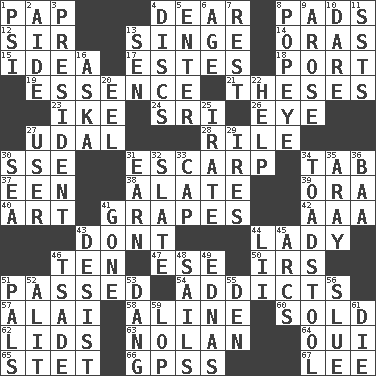 ACROSS 1. Infant food 4. Letter starter 8. Writing tablets 12. Title for a knight 13. Burn superficially 14. Mouths or openings 15. The main thing one is thinking about 17. _____ Park, CO 18. Left side of a ship or aircraft 19. Gist 21. College papers 23. Mamie's mate 24. _ Lanka 26. Sight organ 27. Allodial 28. Cause heat under the collar 30. Compass dir. 31. Fortification 34. Bar bill 37. Car or cant ending 38. Having winglike extensions 39. Mouth or opening 40. Nonscientific branch of learning 41. Wine fruits 42. American Automobile Association (abbr.) 43. Do not 44. Kenny Rogers chart-topper in '80 46. Nine, plus one 47. Compass dir. 50. Big collection agency 51. Went by 54. Inveterate users 57. Mountain range southwest of Kyrgyzstan 58. Place in a line 60. Exchanged or delivered for money 62. Flaplike coverings 63. Pitcher Ryan 64. Fr. "Yes" 65. Proofreading order 66. Global Positioning Systems (abbr.) 67. Area sheltered from the wind DOWN 1. Air pressure measure (abbr.) 2. Assistant 3. Elected leader of a country 4. Flat circles 5. Keyboard key 6. Grow older 7. Remainder 8. Wimpy's pal 9. Came up 10. Have the gumption 11. Fast planes 13. Elected rep. 16. "____ silly question..." 20. Snakelike fish 22. Assist 25. Feeling or showing extreme anger 27. One who makes use of a thing 29. Angers 30. Ocean 31. Merit 32. Chalkboard 33. Head covering 34. Inedible or poisonous agaric 35. Like ___ of sunshine 36. Sound made by sheep 41. Went 43. Cease 44. Cards in a Roman deck? 45. Curves 46. Sadhe (variant) 48. Travel by water 49. Ferber et al. 51. Friends 52. Came down and settled, as after flight 53. Mild oath, euphamism for damn 55. Lair 56. Turn sharply 59. Chop off 61. Expire