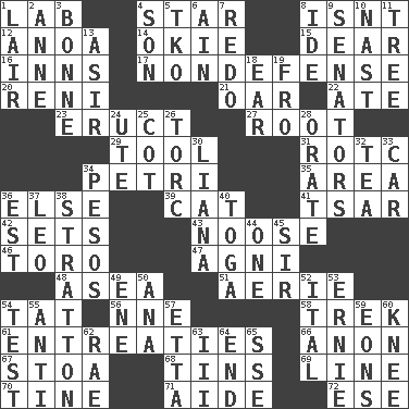ACROSS 1. Experiment locale 4. Play the lead 8. Is not 12. Small Philippine buffalo 14. Migrant worker of the '30s 15. Letter starter 16. Lodging establishments 17. Unrelated to defense, as in spending 20. Painter Guido (1575-1642) 21. Boat paddle 22. Had dinner 23. Spew [out] 27. Carrot, for example 29. Implement 31. College mil. group 34. _ dish (used to culture cells) 35. Type of rug 36. Otherwise 39. Feline 41. Russian ruler of old 42. Puts into a specified state 43. Trap for birds or small mammals 46. "Corrida" creature 47. Hindu god of fire 48. Toward the sea 51. Nest on high 54. Make lace 56. Compass dir. 58. Long journey 61. Pleas 66. At once, immediately (arch.) 67. Portico 68. Airtight sealed metal containers 69. Actor's bit 70. Prong on a fork 71. Helper 72. Compass dir. DOWN 1. Den 2. Singer Murray 3. Child's nurse 4. Male offspring 5. Ring climax 6. The 18th letter of the Arabic alphabet 7. Make new 8. Binary compound 9. Legislators 10. Political cartoonist Thomas 11. Family _ (genealogy) 13. SW Saudi Arabia district 18. Hearing organ 19. From 24. Shoshoni 25. Small bed 26. Torque (variant) 28. Declaim 30. Climbing, woody, usually tropical vines 32. Afternoon social gathering 33. Automobile 34. Mexican monetary units 36. Eastern Standard Time (abbr.) 37. Lion 38. Ski resort town in Vermont 40. Ancient Roman robe 44. Single 45. Title for a knight 49. Compass dir. 50. Santa ___, CA 52. Slanted text style (abbr.) 53. Bert's buddy 54. Trial 55. Opposed to 57. Singer James 59. Immeasurably long periods of time 60. Leg joint 62. Actress Charlotte 63. One more than two 64. Conclusion 65. Compass dir.