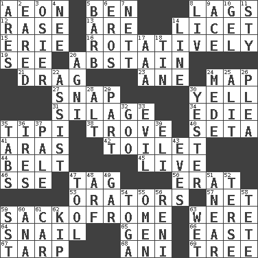 ACROSS 1. A really long time 5. Benjamin's nick name 8. Falls behind 12. To erase 13. "We ___ not amused" (Victoria) 14. It is permitted: Lat. 15. One of the Great Lakes 16. Rotating or pertaining to rotation 19. Perceive with the eye 20. Choose not to consume 21. To trail on the ground 23. One (Scot) 24. Atlas unit 27. Fastener 30. Shout 31. Fodder prepared in a silo 34. Singer Brickell 35. Native american tent (variation) 38. Collection of objects 40. Bristle 41. Ancient river in northeast Turkey 42. Bathroom 44. Waist strap 45. Not recorded 46. Compass dir. 47. Label 50. Part of Q.E.F. 53. Speakers 57. Fish or hair follower 59. Italian handbag shop? 63. We are 64. Slow-paced one 65. Commissioned mil. rank 66. Compass direction 67. Canvas cover 68. Cuckoo 69. Family _ (genealogy) DOWN 1. Ancient Greek god of war 2. Having ears or earlike features 3. Flexible twig of a willow tree 4. Born 5. Sharp remark 6. Greek god of love 7. Remaining after all deductions 8. 54 in ancient Rome 9. Adept person 10. Set 11. Filthy place 14. Actor's bit 17. Auto club (abbr.) 18. Metal container 20. Hindu god of fire 22. Help 24. Ancient Persian 25. Came down and settled, as after flight 26. Entreaty 28. The first octave above the treble staff 29. Role in a play 30. Next before 32. Thick or sticky substance 33. Morally bad or wrong 35. Bar bills 36. Angers 37. Diluted with white 39. Connecticut Ivy Leaguer 43. Nights before holidays 47. Implement 48. Sandy's bark 49. Slender fish 51. Approach 52. Laconic 54. Ancient Roman robe 55. Presage 56. Painter Guido (1575-1642) 58. Wig 59. Fast jet (abbr.) 60. Santa ___, CA 61. Automobile 62. Sleep 63. Soggy