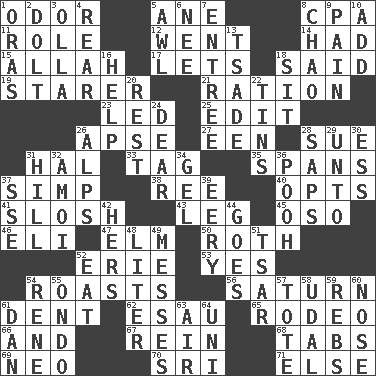 ACROSS 1. Aroma 5. One (Scot) 8. Numbers guy (abbr.) 11. Hero or heavy, e.g. 12. Gone 14. Possessed 15. Assad's deity 17. Allows 18. Alleged 19. A viewer who gazes fixedly 21. Food allowance for one day 23. Directed 25. Prepare for publication 26. Domed church section 27. Car or cant ending 28. Institute legal proceedings 31. Actor Linden 33. Label 35. Connects, as a bridge 37. Simple or foolish person 38. To sift 40. Elects 41. Agitate, as a liquid 43. Part of a journey 45. Bear (Spanish) 46. Biblical high priest 47. Shade tree 50. Writer of Portnoy's Complaint (1969) 52. 4th largest of the Great Lakes 53. It is so 54. Cooks with dry heat, as in an oven 56. Titan orbits this 61. Incision 62. He sold his birthright 65. Cowboy competition 66. Added to 67. It's straight from the horse's mouth 68. Bar bills 69. Modern: prefix 70. Indian title of respect (Mr.) 71. Otherwise DOWN 1. Mouths or openings 2. Stupid person 3. Rounded earthenware pot or jar 4. Located in or toward the back 5. Leather borer 6. Born 7. Main course 8. US Secretary of Labor Elaine L. _ 9. Ache 10. Find the sum of 13. Sadhe (variant) 16. Aid 18. Be seated 20. State of inaction 22. Canisters 24. Letter starter 26. High mountains 28. Plant excrements 29. To (old English) 30. Double-curved letter 31. Land elevation 32. Mine, in Marseilles 34. Set 36. "Silly old bear" 37. Compass dir. 39. Suggestive of the supernatural 42. Possessive pronoun 44. Leaves 48. 61 cubic inches 49. Makes clutter 51. Russian ruler of old 52. Erode 54. French philosopher Descartes 55. Southwest Nigerian state 57. Carry 58. Allodial 59. Confederate soldiers (slang) 60. Characteristic smell of wine 61. Daniel's nick name 63. Wind 64. University (slang)