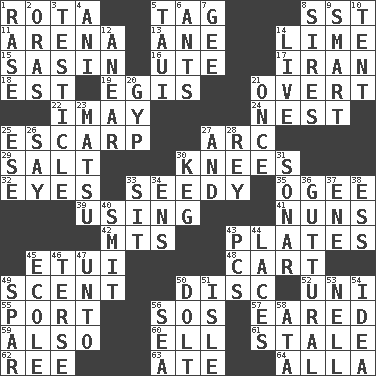 ACROSS 1. Roll call or roster of names 5. Label 8. Fast jet (abbr.) 11. Sports stadium 13. One (Scot) 14. Welles in "The Third Man" 15. Indian antelope 16. Shoshoni 17. SW Asia republic 18. Eastern Standard Time (abbr.) 19. The front part of a cuirass 21. Unconcealed 22. "If ____ say so..." 24. Egg locale 25. Fortification 27. Curve 29. Table seasoning 30. Leg joints 32. Sight organs 33. Sleazy 35. Double curve, resembling the letter S 39. Exploiting 41. Religious women 42. Mountains (abbr.) 43. Food holders 45. Needle holder 48. Draw slowly or heavily 49. Aroma 50. Compact _ 52. University (slang) 55. Sweet dark-red dessert wine 56. Distress signal 57. Having ears or earlike features 59. In addition 60. Pipe bend 61. Having lost freshness 62. To sift 63. Had dinner 64. Silent film actress Nazimova DOWN 1. To erase 2. Mouths or openings 3. A testis 4. Cuckoo 5. "Change" in Tahitian 6. Pismires 7. Unit of force equal to gravity 8. Founders of families 9. Don Adams' spy role 10. Portable shelter 12. Approach 14. Not recorded 20. Swindle 21. At one time in the past 23. Taiwanese island in East China Sea 25. Compass dir. 26. Declare 27. Plus 28. Marina Del _, California 30. Cask 31. Underwater navigation system 33. Be seated 34. Followers of ems 36. From the throat 37. Compass dir. 38. Curvy letter 40. Stricken, poetically 43. Personal Computers (abbr.) 44. Shoestrings 45. Learning spot: Fr. 46. Laconic 47. To (old English) 49. Practice fight 50. Stupid person 51. Small island 53. 1994 drama film starring Jodie Foster 54. The main thing one is thinking about 56. Ocean 58. "One Day ___ Time"
