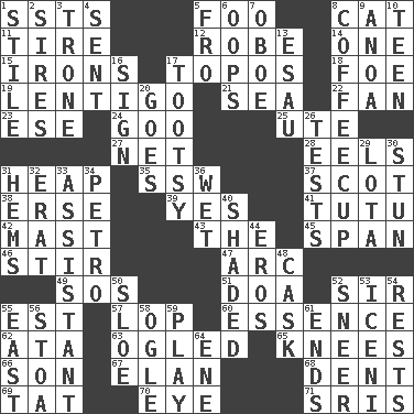 ACROSS 1. Fast planes 5. Egg _ yung 8. Feline 11. Hoop that covers a wheel 12. Loose flowing garment 14. Single 15. Metal shackles 17. Literary convention 18. Enemy 19. Small, flat, pigmented spot on the skin 21. Ocean 22. Air blower 23. Compass dir. 24. Thick or sticky substance 25. Shoshoni 27. Fish or hair follower 28. Snakelike fish 31. Pile 35. Compass dir. 37. Highlander 38. Celtic language 39. Affirmative reply 41. Ballerina skirt 42. Vertical spar for supporting sails 43. Definite Article 45. Connect, as a bridge 46. Use a swizzle stick 47. Curve 49. Distress signal 51. ___ good deed 52. Title for a knight 55. Eastern Standard Time (abbr.) 57. Chop off 60. Center 62. "One Day ___ Time" 63. Stared at amorously 65. Leg joints 66. Manchild 67. Style 68. Incision 69. Make lace 70. Sight organ 71. Indian titles of respect DOWN 1. Vertical member of a panel or frame 2. Founders of families 3. Heavy duty weighing machine 4. Posted 5. Back 6. I made a mistake 7. Mitch Miller's instrument 8. Java holder (2 wds.) 9. Small Philippine buffalo 10. Adolescent 13. He sold his birthright 16. Public display of a written message 17. Tootsie (variant) 20. Moves 26. Trials 29. Globular water bottle used in Asia 30. Astound 31. Equivocates 32. Part of Q.E.F. 33. Helper 34. Stone: prefix 36. Soggy 40. Cast a shadow over 44. Greek god of love 48. Keg 50. _ gin 52. Scornful expression 53. Ancient Celtic tribe of eastern Britain 54. Musical pauses 55. Compass direction 56. Portico 58. Stare at amorously 59. Frolic 61. Extremities 64. Compass dir.