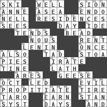 ACROSS 1. What Jean-Claude Killy likes to do 4. Not ill 8. The Jewish people; Israel 12. Singer Murray 14. At sea 15. Inside; within (prefix) 16. 1994 drama film starring Jodie Foster 17. Dwellings 20. Perceives with the eye 21. 24 hours 22. Binary compound 23. Watches over 27. Necklace unit 29. Good sense 31. Monthly bill 34. Soviet premier 1918-24 35. Single time 36. In addition 39. Small amount or degree 41. Portico 42. Sliced desserts 43. Feeling or showing extreme anger 46. Prong on a fork 47. Thin strip of wood or metal 48. Ancient Greek god of war 51. Honkers 54. Sep. follower 56. Directed 58. Morally bad or wrong 61. Appease 66. Become fatigued 67. Pacific island yam 68. Merit 69. Comedian Laurel of Laurel & Hardy 70. System (abbr.) 71. 24-hour periods 72. Added to DOWN 1. Without 2. Leg joint 3. An arm off of a larger body of water 4. Armed conflict 5. Compass dir. 6. French article 7. Put down 8. Elected rep. 9. Event 10. Wrote a lyric poem 11. Sense of smell 13. Otherwise 18. Apply (a substance) by light strokes 19. Sight organ 24. Compass dir. 25. Spanish title 26. Set of matching outer garments 28. Came up 30. Slow-paced one 32. Non-commissioned officer (abbr.) 33. Beverage made from leaves 34. Failure 36. Fitting 37. Cards in a Roman deck? 38. Elected representatives 40. To trail on the ground 44. Had dinner 45. Definite Article 49. Biblical high priest 50. Put into a specified state 52. Puts into a specified state 53. Webber/Rice musical 54. Elects 55. Supercomputer manufacturer 57. Passed on 59. SW Asia republic 60. Grant temporary use of 62. Cooking vessel 63. Auto club (abbr.) 64. Attempt 65. Followers of ems
