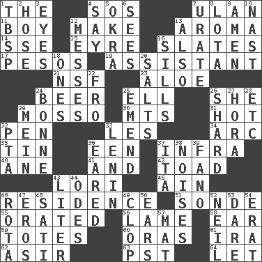ACROSS 1. Definite Article 4. Distress signal 7. ____ Bator 11. Male child 12. Create 13. Odor 14. Compass dir. 15. Jane of fiction 16. Chalkboards 17. Mexican monetary units 19. Aide 21. Overdraft (abbr.) 23. _ vera 24. Fermented drink made from hops 25. Pipe bend 26. A female animal or person 29. With motion or animation 30. Mountains (abbr.) 31. Being at a high temperature 32. Writing instrument 33. French article 34. Curve 35. Metal container 36. Car or cant ending 37. Kind of red light 40. One (Scot) 41. Added to 42. Frog relative 43. Australian parrot (variant) 45. The 18th letter of the Arabic alphabet 46. Home 51. Something which is sent 55. Declaimed 56. Unable to walk 58. Ewer handle 59. Hauls 60. Mouths or openings 61. Retirement account (abbr.) 62. SW Saudi Arabia district 63. Pacific Standard Time (abbr.) 64. Allow DOWN 1. Cook's measure (abbr.) 2. Flexible conduit 3. Sight organs 4. Declare 5. Gumbo ingredient 6. Observes 7. A salt of uric acid 8. Globular water bottle used in Asia 9. So be it 10. Political cartoonist Thomas 12. Makes clutter 13. In addition 16. Beverly of Met fame 18. Singles 20. Table seasonings 22. Back 24. Child's nurse 25. Make improvements or corrections to 26. Broken piece 27. Israeli folk dance 28. And so on (abbr.) 29. Chow _ 32. Parent Teacher Association (abbr.) 33. Soviet premier 1918-24 36. Having ears or earlike features 37. Call ___ day 38. Annoying sounds 39. Papal veil 43. 61 cubic inches 44. Lyric poems 46. Round or rotation of duties 47. Greek god of love 48. Suttee (variant) 49. Hoof sound 50. Hearing organs 52. Famous astronaut Armstrong 53. Have the gumption 54. Part of Q.E.F. 57. Floor protector