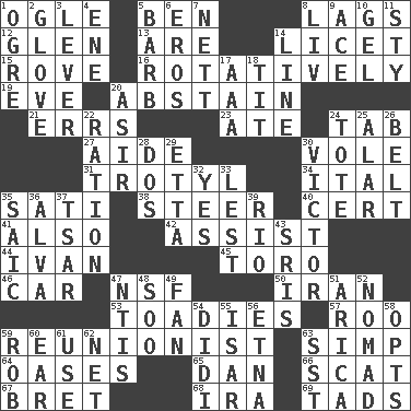 ACROSS 1. Stare at amorously 5. Benjamin's nick name 8. Fails to keep up a pace 12. Small, secluded valley 13. "We ___ not amused" (Victoria) 14. It is permitted: Lat. 15. Be footloose 16. Producing rotation 19. First lady 20. Choose not to consume 21. Blunders 23. Had dinner 24. Keyboard key 27. Helper 30. Grand slam 31. TNT 34. Slanted text style (abbr.) 35. Suttee (variant) 38. Navigate 40. Certainty 41. In addition 42. Aid 44. "Terrible" tsar 45. "Corrida" creature 46. 4-wheeled motor vehicle 47. Overdraft (abbr.) 50. SW Asia republic 53. Sycophants 57. Friend of Pooh 59. One who advocates reunion 63. Simple or foolish person 64. Fertile tracts in a desert 65. One of the 12 tribes of Israel 66. Scram, to a cat 67. Cy Young winner Saberhagen 68. Lyricist Gershwin 69. Small boys DOWN 1. Legendary monster 2. Michael Jackson trademark 3. Prying instrument 4. Compass dir. 5. Sharp remark 6. Greek god of love 7. Remaining after all deductions 8. 54 in ancient Rome 9. Adept person 10. Set 11. Filthy place 14. Actor's bit 17. American Automobile Association (abbr.) 18. Teat (slang) 20. SW Saudi Arabia district 22. Food allowance for one day 24. Carry 25. Having or resembling wings 26. Waist strap 28. Two (Sp.) 29. Singer James 30. Winning man's name 32. It is so 33. For fear that 35. Ketch in the Levant 36. Inventor's middle name 37. Russian ruler of old 39. _ de Janeiro 43. Indian titles of respect 47. Nuclear Threat Initiatives 48. "Barney Miller" actor Jack 49. Air blower 51. N. Chile seaport 52. Wanderer 54. "You Light Up My Life" star Conn 55. Austrian river, tributary to the Danube 56. Inactive volcano in Sicily 58. Chooses 59. Director Reiner 60. Hearing organ 61. Purpose 62. Fish or hair follower 63. Fast jet (abbr.)
