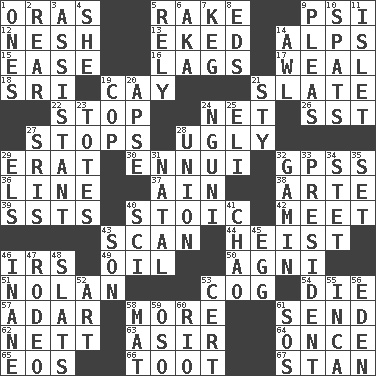 ACROSS 1. Mouths or openings 5. Immoral or dissolute person 9. 23rd letter of the Greek alphabet 12. Soft 13. Made supply last 14. High mountains 15. Comfort 16. Fails to keep up a pace 17. Welt 18. _ Lanka 19. Island 21. Chalkboard 22. Discontinue 24. Fish or hair follower 26. Fast jet (abbr.) 27. Ceases 28. Unsightly 29. Part of Q.E.F. 30. World-weariness 32. Global Positioning Systems (abbr.) 36. Actor's bit 37. The 18th letter of the Arabic alphabet 38. Johnson of "Laugh-In" 39. Fast planes 40. Unemotional 42. Rendezvous 43. Examine minutely or intensely 44. Robbery 46. Big collection agency 49. Lubricate 50. Hindu god of fire 51. Pitcher Ryan 53. Gear tooth 54. Pass on 57. The sixth month of the Jewish calendar 58. Greater amount 61. Transmit 62. Remaining after all deductions 63. SW Saudi Arabia district 64. At one time in the past 65. Greek goddess of the dawn 66. A blast of a horn 67. Comedian Laurel of Laurel & Hardy DOWN 1. Washington bills 2. Tail end 3. Aide 4. A female animal or person 5. Have trust in 6. Alias (abbr.) 7. Cask 8. Begley and Asner 9. Entreaties 10. Arguments over trivial matters 11. Small island 14. Leather borer 19. Police officer (slang) 20. Domed church section 21. Filthy place 23. Hauls 24. Group of southern Bantu languages 25. Biblical high priest 27. Indian titles of respect 28. The state of being joined or united 29. Raised railways 31. Brizilian seaport 32. Homeless child 33. Elected leader of a country 34. Proofreading order 35. Arrange properly for use 40. _-fi 41. US Secretary of Labor Elaine L. _ 43. Boy, to dad 45. Oval reproductive body of a fowl 46. Empty; void 47. Cowboy competition 48. Narrow boards 52. Tate display 53. An absolute certainty 55. South American Indian 56. Genesis locale 58. Floor covering 59. Bear (Spanish) 60. _ de Janeiro 61. Distress signal