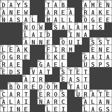 ACROSS 1. 24-hour periods 5. Bar bill 8. So be it 12. Afresh 13. Type of rug 15. Immoral or dissolute person 16. Relating to the nose 18. Promenade 19. Double curve, resembling the letter S 20. Immediately 22. Deli grouping 24. Put down 26. _ tizzy (2 wds.) 27. Queen of England 1702-14 28. Fr. "Yes" 29. Fast jet (abbr.) 32. Path through which fluid escapes 35. Become taut 37. Compass dir. 38. Legendary monster 39. Supplement with great effort 40. Greek goddess of the earth (variant) 41. Actress Charlotte 42. Highlander 43. United States Postal Service (abbr.) 44. Begley and Asner 45. Large container 46. Proofreading order 49. Atmosphere 50. Compass direction 51. Mood resulting from idleness 55. The 19th letter of the Greek alphabet 56. Draw slowly or heavily 57. Greek god of love 59. A salt of uric acid 63. Jai _ 64. Drug cop 65. ____ Jay Lerner 66. Prong on a fork 67. Luau accessory 68. Straggles DOWN 1. Daniel's nick name 2. Santa ___, CA 3. Consenting reply 4. Tchaikovsky ballet 5. Scottish cap 6. Ancient river in northeast Turkey 7. Actor Lugosi 8. Scent 9. Wise men 10. Makes supply last 11. Born 14. Plant genus of onion and garlic 17. Grant temporary use of 21. Victory 23. Cuckoo 25. Outscore 28. Threatening words 29. Oceans 30. Clip 31. Beverages made from leaves 32. Old wives' tales, e.g. 33. Mild oath 34. Ancient Greek god of war 36. D.D.E's nickname 40. From the throat 42. Place where plants grow 45. Compete 47. Make lace 48. He sold his birthright 49. Nick name for Arthur 51. Indonesian resort city 52. NW Algerian seaport 53. Spoken 54. Greater amount 56. Domesticated feline 58. _-fi 60. According to 61. Label 62. Followers of ems