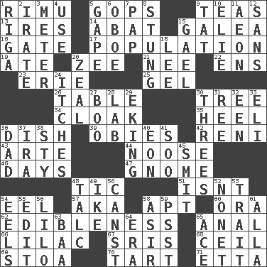 ACROSS 1. Tall New Zealand timber tree 5. Republicans 9. Beverages made from leaves 13. Angers 14. Blind as ____ 15. An organ shaped like a helmet 16. Yard entry 17. Census information 19. Had dinner 20. Last letter of the English alphabet 21. Born 22. Followers of ems 23. One of the Great Lakes 25. Set 26. Eating place 30. Woody plant 34. Covering 35. The bottom of a shoe or boot 36. Food container 39. Off-Broadway awards 42. Painter Guido (1575-1642) 43. Johnson of "Laugh-In" 44. Trap for birds or small mammals 46. 24-hour periods 47. Dwarf 48. Nervous spasm 51. Is not 54. Snakelike fish 57. Alias (abbr.) 58. Fitting 60. Mouth or opening 62. The property of being fit to eat 65. Of or related to the anus 66. Pale purple color 67. Indian titles of respect 68. To provide with a ceiling 69. Portico 70. Small pie 71. Singer James DOWN 1. Port city in Latvia 2. Feeling or showing extreme anger 3. Distance measurement 4. Purpose 5. Stare wonderingly 6. Mitch Miller's instrument 7. Infant food 8. Feeling sharp psychological pain 9. Make lace 10. Writer Wiesel 11. Period of immesurable duration 12. Without 15. Highlander 18. Area sheltered from the wind 20. Ardor 24. Skin irritations 27. Oct. 31 cry 28. Experiment locale 29. Supplementing with great effort 30. Threesomes 31. Portuguese money of account (variant) 32. Car or cant ending 33. Connecticut Ivy Leaguer 36. Male parent 37. Lyricist Gershwin 38. Filthy place 40. Period of immesurable duration 41. "Barney Miller" actor Jack 45. Stricken, poetically 48. Baby powder 49. Mamie's husband 50. 2nd pers. sing. pres. of can (arch.) 52. Music written for nine 53. Distinguishing feature 54. Snakelike fish 55. Prepare for publication 56. _ and Stitch 58. SW Saudi Arabia district 59. Inconspicuous attention getter 61. Silent film actress Nazimova 63. Sound made by sheep 64. Period 65. Adept person