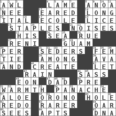 ACROSS 1. Leather borer 4. Unable to walk 8. Small Philippine buffalo 12. Born 13. Having ears or earlike features 14. Yearn 15. Slanted text style (abbr.) 17. Learning spot: Fr. 18. Louse (plural) 19. Paper fasteners 21. Annoying sounds 23. Part of HMS, perhaps 24. Ocean 26. Regret 27. Painter Guido (1575-1642) 28. Island territory of the United States 30. For each 31. Spring feasts 34. Opposite of masc. 37. Neckwear 38. Amid 39. Actress Gardner 40. Also 41. Make 42. Allow 43. Water falling in drops from the sky 44. Backtalk 46. Age 47. June honoree 50. Before (prefix) 51. Heat 54. Flamboyance 57. _ vera 58. U. of Maine site 60. Opening into or through something 62. Redecorate 63. More valued for its uncommonness 64. Rowing implement 65. Observes 66. Tenement units (abbr.) 67. Heredity factor (abbr.) DOWN 1. Cuckoo 2. Moistens 3. Tough but pliablecoriaceous 4. Shoestrings 5. Came up 6. Cartoonist voice _ Blanc 7. Paradise 8. Plant genus of onion and garlic 9. Annoying sound 10. Single time 11. Eras 13. Snakelike fish 16. (Had) reclined 20. Air pressure measure (abbr.) 22. Mouths or openings 25. Representative 27. It's straight from the horse's mouth 29. Goad 30. Parent Teacher Assoc. 31. Indian skirt 32. Make improvements or corrections to 33. ___ good deed 34. It jiggles the polygraph 35. Nights before holidays 36. Floor protector 41. Patter 43. Lover boys 44. Health resort 45. Bowlike part 46. Eat (away) 48. To the left, to Queeg 49. Natives or inhabitants of Denmark 51. Armed conflicts 52. Toward shelter 53. Israeli folk dance 55. And not 56. Enthusiasm 59. Reproach for some lapse or misdeed 61. Period