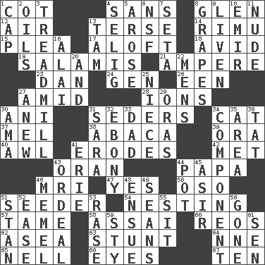 ACROSS 1. Small bed 4. Without 8. Small, secluded valley 12. Wind 13. Laconic 14. Tall New Zealand timber tree 15. Entreaty 17. High up in or into the air 18. Enthusiastic 19. Deli grouping 21. Electrical Unit 23. Daniel's nick name 24. Commissioned mil. rank 26. Car or cant ending 27. Among 28. Charged atoms 30. Cuckoo 31. Spring feasts 34. Feline 37. Cartoonist voice _ Blanc 38. Phillipine bananalike plant 39. Mouth or opening 40. Leather borer 41. Eats (away) 42. Was introduced to 43. NW Algerian seaport 44. Dad 46. Medical imaging device (abbr.) 47. It is so 50. Bear (Spanish) 51. Sowing specialist 54. Nestling 57. Docile 58. Slender Brazilian palm 60. Vintage cars 62. At sea 63. Check the growth or development of 64. Compass dir. 65. 1994 drama film starring Jodie Foster 66. Snake ____ (dice throw) 67. "___ Little Indians" DOWN 1. Head covering 2. Petroleums 3. Excercise machine 4. Former Milwaukee Brewers owner Bud 5. Came up 6. Overdraft (abbr.) 7. Stalk of a moss capsule 8. Raisin fruits 9. Make or become more lively 10. Arab leader 11. Naked 13. Scottish cap 16. Jai _ 20. Added to 22. Not women's 25. Sibling's daughter 27. Afresh 29. Mouths or openings 30. Wet nurse (var.) 31. "Two Mules for Sister ____" 32. Black 33. Male parent 34. Part 35. Length times width 36. Make lace 41. One of the Great Lakes 43. Severe or trying experience 44. Plant holder 45. SW Saudi Arabia district 46. Klaipeda city 48. Follow as a consequence or result 49. Actors Connery and Penn 51. Comedian Laurel of Laurel & Hardy 52. Comfort 53. Raze (variant) 55. Be seated 56. Went 59. Filthy place 61. Elected rep.