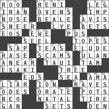 ACROSS 1. Friend of Pooh 4. Painter Guido (1575-1642) 8. Part of a journey 11. SW Asia republic 13. Baking chambers 15. Naughty child 16. Sense of smell 17. Calif. Air Force Base 18. Opinion 19. Contemptuous expression 21. Potassium hydroxide 22. Antes 23. Greek goddess of the dawn 24. She-sheep 27. Festering 29. Stitch closed the eyes of (a falcon) 30. Drinks excessively 34. Plant excrement 36. Afternoon social gatherings 39. Evade 40. Raze (variant) 41. Fraudulent business schemes 43. ____ Bator, Mongolia 44. Approach 46. "Change" in Tahitian 47. Scottish cap 48. 1973 Nobel Price Winner (Physics) Leo 49. Relationship diagram 51. Begley and Asner 53. Ocean 54. Wet nurse (var.) 57. One who doesn't tell the truth 60. Electrically charged atom 63. All-night dance parties 65. Lyric poems 66. Declaim 69. Cooking vessels 70. Modern: prefix 71. Brizilian seaport 72. Hoop that covers a wheel 73. Separate the seeds from cotton 74. Arranges properly for use 75. Lair DOWN 1. Wash lightly 2. U. of Maine site 3. Fertile tracts in a desert 4. Director Reiner 5. Night before a holiday 6. Actress Patricia 7. In an inward manner 8. Moving, as bait 9. Send forth 10. Global Positioning Systems (abbr.) 12. Born 14. Ooze 18. Utter; complete 20. To sift 25. Moistens 26. Choose 28. Shoshoni 29. Orators 31. Monetary unit of Botswana 32. Dutch treat 33. Elected rep. 34. Without 35. Toward the sea 37. American Automobile Association (abbr.) 38. Particles of soot 40. Actress Charlotte 42. Male parent of an animal 45. To free from 50. Ewer handle 52. The Jewish people; Israel 54. Prevent from happening 55. Distance measurement (Brit.) 56. NE Netherlands city 57. Having great length 58. It may be bright or harebrained 59. A really long time 61. Mouths or openings 62. Nathan's nickname 64. Fitting 67. Make lace 68. Raised railways