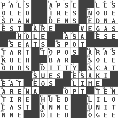 ACROSS 1. Friends 5. Domed church section 9. French article 12. Margarine 13. Angers 14. Connecting point 15. Connect, as a bridge 16. Cub Scout units 17. Pulitzer Prize-winning author Ferber 18. Eastern Standard Time (abbr.) 19. "We ___ not amused" (Victoria) 21. Viva Las _ 22. Hollow 24. White ___ sheet 26. Compass dir. 27. Theater features 28. Specific locale 29. Small pie 30. Traditional theme or motif 32. Ancient river in northeast Turkey 36. Malaysian steamed pastry 37. Drinking establishment 38. Not divided or shared with others 39. Probability 40. Simple song 42. Jazz singing style 43. Takes to court 44. 1973 Nobel Price Winner (Physics) Leo 46. Ingest 49. Greek goddess of the dawn 50. Welles in "The Third Man" 51. Sports stadium 53. Choose 54. "___ Little Indians" 57. Become fatigued 58. Took on color 61. _ and Stitch 62. Compass direction 63. Singer Murray 64. A single undivided whole 65. Compass dir. 66. Passed on 67. Double curve, resembling the letter S DOWN 1. Airs 2. High mountains 3. Resembling or made to resemble leather 4. Male child 5. Assistant 6. Before (prefix) 7. Elected rep. 8. Double-curved letter 9. Cabin 10. Ferber et al. 11. Gospel singer Marvin 14. Born 19. Keyboard modifier key 20. Repose 21. Large container 23. Curses 24. To the left, to Queeg 25. Distress signal 27. Saudi Arabian king (1953-1964) 28. Arguments over trivial matters 29. Ring climax 31. Off-Broadway awards 32. Indian state 33. Shooting up abruptly 34. Jai _ 35. Put into a specified state 40. Superhero pair 41. Sharp bark 43. Ocean 45. Be seated 46. Eroded 47. Believer in; advocate of (suffix) 48. Laconic 52. Fish or hair follower 53. Wrote a lyric poem 55. Writer Wiesel 56. Observe 58. Possessed 59. University (slang) 60. Compass dir. 61. Nilotic language