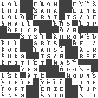 ACROSS 1. Allow head to fall sleepily 4. Inky black, to poets 8. Nights before holidays 12. RI univ. 13. "Two Mules for Sister ____" 14. Actor's bit 15. Words to Nanette 17. Part of Q.E.F. 18. Sadhe (variant) 19. Slow-paced one 21. Followers of ems 23. Trim (branches) 24. Fourth or lowest deck 26. Rowing implement 28. System (abbr.) 30. Moved like an arrow 34. Pipe bend 37. Indian titles of respect 39. Actor Lugosi 40. Friend of Pooh 41. Tarsus (plural) 43. Atmosphere 44. Beer foam 46. Austrian river, tributary to the Danube 47. To sift 48. Curse 51. Vertical spar for supporting sails 54. Consenting reply 55. Trap for birds or small mammals 58. Purpose 61. Had dinner 63. Parts of speech 65. Long narrow piece of something 67. Shout 71. Prong on a fork 72. Left side of a ship or aircraft 73. One of the Great Lakes 74. Uncastrated adult male sheep 75. Backtalk 76. Stated 77. Be seated DOWN 1. Religious women 2. U. of Maine site 3. Middle Eastern gold or silver currency 4. Compass dir. 5. Soap unit 6. Mouth or opening 7. Nathan's nickname 8. Raised railways 9. Small bottle 10. Inside; within (prefix) 11. Ooze 16. Lubricates 18. Russian ruler of old 20. Myrna of the movies 22. And not 25. Inconspicuous attention getter 27. Director Reiner 29. Distinguishing feature 30. Indian state 31. Erode 32. Writer Wiesel 33. Have the gumption 34. Celtic language 35. Central Nebraska county 36. Farming town in central California 38. Big collection agency 42. SW Asia republic 45. Filthy place 49. Pile 50. Eastern Standard Time (abbr.) 52. Boy, to dad 53. A blast of a horn 56. Sets or collections 57. World-weariness 58. United States Postal Service (abbr.) 59. Portico 60. Blunders 62. Sight organs 64. Back-to-school mo. 66. It is 68. Epoch 69. Cards in a Roman deck? 70. Directed