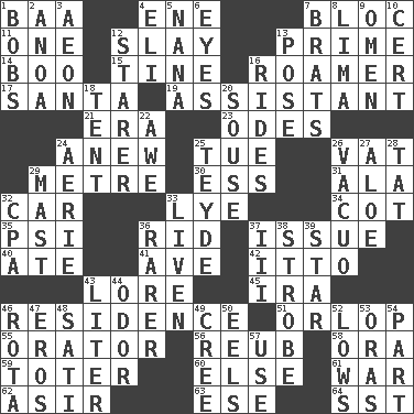 ACROSS 1. Sound made by sheep 4. Compass dir. 7. Alliance 11. Single 12. Kill 13. First class 14. Surprise greeting 15. Prong on a fork 16. Wanderer 17. Before Barbara or Clara 19. Aide 21. Epoch 23. Lyric poems 24. Afresh 25. Third day of the wk. 26. Large container 29. Distance measurement (Brit.) 30. Curvy letter 31. Wing 32. Auto 33. Sodium hydroxide 34. Small bed 35. 23rd letter of the Greek alphabet 36. To free from 37. Come out of 40. Had dinner 41. "___ Maria" 42. "Tell ____ the Marines!" 43. Old wives' tales, e.g. 45. Lyricist Gershwin 46. Home 51. Fourth or lowest deck 55. Speaker 56. Reuben's nickname 58. Mouth or opening 59. Carrier 60. Otherwise 61. Armed conflict 62. SW Saudi Arabia district 63. Compass dir. 64. Fast jet (abbr.) DOWN 1. Moves up and down 2. Small Philippine buffalo 3. Period of immesurable duration 4. Connecticut Ivy Leaguer 5. Nanny 6. Snake ____ (dice throw) 7. Naughty children 8. Pale green bean 9. Presage 10. An absolute certainty 12. A viewer who gazes fixedly 13. Introduce or present, as a question 16. Amusement-park features 18. Portable shelter 20. Boozer 22. Deep reverence 24. Nest on high 25. Miss Universe 1986, Barbara Palacios _ 26. In a vacuum (with "in") 27. _ vera 28. Make lace 29. Vertical spar for supporting sails 32. Numbers guy (abbr.) 33. Make or become more lively 36. More valued for its uncommonness 37. One more than two 38. Disco prop 39. Play the lead 43. 61 cubic inches 44. Scent 46. Roll call or roster of names 47. Greek god of love 48. Suttee (variant) 49. Algonquian 50. Snakelike fish 52. Coldest temperatures 53. Mouths or openings 54. Role in a play 57. Purpose