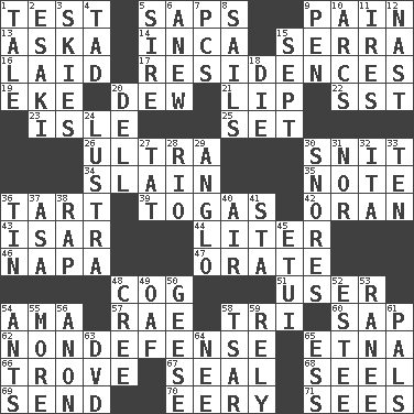 ACROSS 1. Trial 5. Plant excrements 9. Ache 13. "____ silly question..." 14. South American Indian 15. Father Junipero _ 16. Put down 17. Dwellings 19. Make supply last 20. Morning condensation 21. Mouth edge 22. Fast jet (abbr.) 23. Small island 25. Put into a specified state 26. Extreme 30. In a ____ (agitated or irritated) 34. Killed 35. Brief written record 36. Small pie 39. Ancient Roman robes 42. NW Algerian seaport 43. Austrian river, tributary to the Danube 44. 61 cubic inches 46. California wine valley 47. Declaim 48. Gear tooth 51. One who uses or employs something 54. Nanny (var.) 57. Actress Charlotte 58. Three (prefix) 60. Plant excrement 62. Unrelated to defense, as in spending 65. Inactive volcano in Sicily 66. Collection of objects 67. Lick closed 68. Stitch closed the eyes of (a falcon) 69. Transmit 70. Suggestive of the supernatural 71. Observes DOWN 1. Lie 2. 1973 Nobel Price Winner (Physics) Leo 3. Atmospheres 4. Bit 5. Male parent of an animal 6. Afresh 7. Personal Computers (abbr.) 8. Travel by water 9. Animal enclosure 10. Curves 11. Angers 12. Political cartoonist Thomas 15. Back-to-school mo. 18. Pass on 20. Small valley 24. A period of five years 27. Make lace 28. _ de Janeiro 29. White American of non-Hispanic descent 30. Sounds asleep 31. Not either 32. Call ___ day 33. Nine, plus one 36. Metal container 37. White ___ sheet 38. Reproach for some lapse or misdeed 40. Wind 41. R.R. building 45. Needle case 48. Algonquian 49. Clumsy lout 50. Honkers 52. First name in cosmetics 53. Indian princess (variant) 54. Pismires 55. Greater amount 56. At once, immediately (arch.) 58. Russian ruler of old 59. Have trust in 61. Friends 63. Movie disc 64. Born 65. Double-curved letter