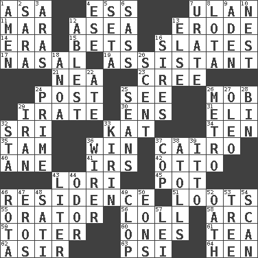 ACROSS 1. White ___ sheet 4. Double-curved letter 7. Uhlan (variant) 11. Make imperfect 12. At sea 13. Wear away 14. Period 15. Wagers 16. Chalkboards 17. Rhinal 19. Helper 21. Teachers' org. 23. Algonquian 24. Mail 25. Observe 26. Disorderly crowd 29. Feeling or showing extreme anger 30. Followers of ems 31. Biblical high priest 32. Indian title of respect (Mr.) 33. Krazy ___ of comics 34. "___ Little Indians" 35. Scottish cap 36. Acquire through effort 37. Capital of Egypt 40. One (Scot) 41. Big collection agency 42. Von Bismarck 43. Australian parrot (variant) 45. Plant holder 46. Home 51. Plunders 55. Speaker 56. Hang loosely or laxly 58. Curve 59. Carrier 60. Washington bills 61. Beverage made from leaves 62. SW Saudi Arabia district 63. Air pressure measure (abbr.) 64. Layer DOWN 1. So be it 2. "Two Mules for Sister ____" 3. Caspian sea tributary 4. Compass dir. 5. Stalk of a moss capsule 6. Backtalk 7. A salt of uric acid 8. Globular water bottle used in Asia 9. Arabian gulf 10. A home for chicks 12. Most capable 13. Otherwise 16. Fathers 18. Small Philippine buffalo 20. Odor 22. Had dinner 24. First class 25. Actors Connery and Penn 26. Paris' subway 27. Butter sub 28. Storage container 29. SW Asia republic 32. R.R. building 33. Japanese brewing company 36. One who wires 37. Police officer (slang) 38. Ringlike coral islands and reefs 39. "Tell ____ the Marines!" 43. 61 cubic inches 44. Aroma 46. Roll call or roster of names 47. Greek god of love 48. Suttee (variant) 49. Hoof sound 50. Immeasurably long periods of time 52. Pledge 53. Relationship diagram 54. Examine hastily 57. Luau accessory