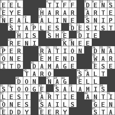 ACROSS 1. Snakelike fish 4. Small quarrel 8. Cub Scout units 12. Sight organ 13. Ethiopian city, capital of Harari 14. Johnson of "Laugh-In" 15. Actress Patricia 17. Place in a line 18. Clip 19. Paper fasteners 21. Stop 23. Part of HMS, perhaps 24. A female animal or person 26. Pass on 27. Painter Guido (1575-1642) 28. Leg joint 30. For each 31. Food allowance for one day 34. Heredity factor (abbr.) 37. Single 38. Make improvements or corrections to 39. Armed conflict 40. It would 41. Break 42. Compass dir. 43. Edible starchy tuberous root 44. Table seasoning 46. Spanish title 47. Tired old horse 50. Pipe bend 51. Moe Howard, for one 54. Deli grouping 57. For fear that 58. Nick name for Arthur 60. Opposed to 62. Washington bills 63. Travel by water 64. Commissioned military rank (abbr.) 65. Whirlpool 66. Suggestive of the supernatural 67. R.R. building DOWN 1. Car or cant ending 2. Snake ____ (dice throw) 3. Resembling or made to resemble leather 4. Lies 5. From or relating to Ireland 6. Avid follower 7. Flintstone 8. Small ungulate mammals of Africa 9. Bert's buddy 10. Nuclear Threat Initiatives 11. Back-to-school mo. 13. Actor Linden 16. (Had) reclined 20. Air pressure measure (abbr.) 22. Paradise 25. Supplementing with great effort 27. Monthly bill 29. Connecting point 30. Luau course 31. Buttocks 32. ID or VA city 33. Afternoon social gathering 34. Residences 35. Political cartoonist Thomas 36. "We ___ not amused" (Victoria) 41. Mild oath, euphamism for damn 43. Tootsie (variant) 44. Ocean 45. _ mater 46. Administered medicine 48. Being in motion 49. Lightheartedly 51. A type of plum 52. Look after 53. Comfort 55. French article 56. Proofreading order 59. Actress Charlotte 61. _ tizzy (2 wds.)