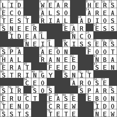 ACROSS 1. Hat (slang) 4. Erode 8. Possessive pronoun 12. Environmental prefix 13. In addition 14. Type of rug 15. Trial 17. Monetary unit of Yemen 18. Goodbye (Sp.) 19. Contemptuous expression 21. Hearing organ 23. Curvy letter 24. Standard of perfection 26. Non-commissioned officer (abbr.) 28. Famous astronaut Armstrong 30. Smoochers 34. Health resort 37. A really long time 39. One third of a yard 40. Actor Linden 41. The wife of a rajah (variant) 43. Basketball assoc. 44. Part of Q.E.F. 46. Nourish 47. Elected rep. 48. Slender, wiry 51. In a ____ (agitated or irritated) 54. Corporate head (abbr.) 55. Came up 58. Title for a knight 61. Distress signal 63. Practice fights 65. Spew [out] 67. Relaxation 71. Inky black, to poets 72. Look after 73. Group working together 74. Wedding promise 75. Fast planes 76. Wig 77. ___ Haven, CT DOWN 1. Allows 2. Ancient Celtic tribe of eastern Britain 3. Administered medicine 4. Armed conflict 5. Biblical high priest 6. White ___ sheet 7. Hero or heavy, e.g. 8. Possessed 9. One of the Great Lakes 10. Vintage cars 11. Backtalk 16. Adolescent 18. Arches 20. Actress Charlotte 22. Black tropical American cuckoo 25. One who doesn't tell the truth 27. Order of Saint Francis (abbr.) 29. Like summer trees 30. Leg joints 31. Immeasurably long periods of time 32. Loose flowing garment 33. Comedian Laurel of Laurel & Hardy 34. "______ My Girl" (Turtles hit) 35. Component 36. Having or resembling wings 38. Single 42. Pulitzer Prize-winning author Ferber 45. Nervous spasm 49. Egg locale 50. Thick or sticky substance 52. Big collection agency 53. Drink excessively 56. Unit of acoustic absorption 57. Wear away 58. Puts into a specified state 59. Angers 60. Undersized animal 62. Religious group 64. Overwhelm 66. Music discs 68. "We ___ not amused" (Victoria) 69. Arrange properly for use 70. She-sheep