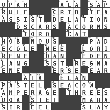 ACROSS 1. Brightly colored fish 5. In the manner of 8. Plant excrement 11. Governing power 12. Baby bed with high sides 13. Afternoon social gathering 14. Aid 17. Accusation by an informer 19. Motion picture awards 21. Oak nuts 22. "Corrida" creature 23. Domesticated feline 24. Crowd into 27. Horse sense 29. Writing tablet 32. Learning spot: Fr. 34. Born 36. Australian parrot (variant) 37. French philosopher Descartes 38. One of the 12 tribes of Israel 39. Paradise 40. Austrian-born American filmmaker Fritz 41. Fast jet (abbr.) 42. Canadian anthropologist Darnell 43. Compass dir. 44. Celtic language 46. Ewer handle 47. _ moment's notice (2 wds.) 50. Enthusiasm 52. Soft color 55. Manatee 57. Electrical Measurement 59. Threesomes 62. ___ good deed 63. Proofreading order 64. Hindu Mythology: god of death 65. Title for a knight 66. Snakelike fish 67. Kill DOWN 1. Mouth or opening 2. Ichor 3. In addition 4. Robbery 5. "We ___ not amused" (Victoria) 6. Pale purple color 7. Phillipine bananalike plant 8. Agitate 9. Age 10. Baking dishes 12. Music discs 15. Biscuitlike quick bread 16. Edible starchy tuberous root 18. Small child 20. Periods in a boxing match 24. Haggard of country music 25. Sea 26. Child's nurse 28. Gospel singer Marvin 29. Puddle 30. Sports stadium 31. Middle Eastern gold or silver currency 33. Part of a journey 35. Main course 36. Area sheltered from the wind 42. Arrive at 45. Narrow board 47. Had dinner 48. Laconic 49. Having winglike extensions 51. Typical models 52. Groovy apts. 53. Mine, in Marseilles 54. Coast Guard woman 55. Arrange properly for use 56. Welt 58. Set 60. Epoch 61. Declare
