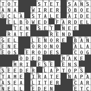 ACROSS 1. Small child 4. Proofreading order 8. Without 12. Santa ___, CA 13. One who wires 14. Mitch Miller's instrument 15. Southern CA. univ. 17. Lacking originality or spontaneity 18. Helper 19. Shoved, as through a crowd 21. Pack 23. Nine, plus one 24. Put into a specified state 26. Born 27. Pace 28. Tear apart 30. Set 31. Poe poem 34. Bar 37. Compass dir. 38. U. of Maine site 39. According to 40. Greek goddess of the dawn 41. Eats (away) 42. Gear tooth 43. Wrote a lyric poem 44. Create 46. Medical imaging device (abbr.) 47. Compass dir. 50. Followers of ems 51. Sowing specialist 54. Portable computers 57. Docile 58. Feeling or showing extreme anger 60. California wine valley 62. Toward the sea 63. 61 cubic inches 64. 4-wheeled motor vehicle 65. 1994 drama film starring Jodie Foster 66. Genesis locale 67. And so on (abbr.) DOWN 1. The 19th letter of the Greek alphabet 2. Single time 3. Baron Munchausen's specialties 4. Settings 5. Swap 6. Snakelike fish 7. Unclean, religiously 8. Flew 9. Remain 10. Connecting point 11. Stitch closed the eyes of (a falcon) 13. Compass dir. 16. Collude with 20. Single 22. Singer Murray 25. Marketplace scale 27. Western Nevada city 29. Greek god of love 30. Turn to the right 31. Old wives' tales, e.g. 32. Wear away 33. Allow head to fall sleepily 34. Keyboard key 35. Medicinal plant 36. Tired old horse 41. Singer Brickell 43. Severe or trying experience 44. Was introduced to 45. Soon (poet.) 46. Klaipeda city 48. Chalkboard 49. Eroded 51. Comedian Laurel of Laurel & Hardy 52. Relaxation 53. Cause heat under the collar 55. For each 56. Argument over a trivial matter 59. To free from 61. Curve