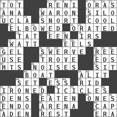 ACROSS 1. Small child 4. Painter Guido (1575-1642) 8. Mouths or openings 12. Santa ___, CA 13. Make _____ (do battle with) 14. Grain storage tower 15. Southern CA. univ. 17. Derisive sound 18. Calm and collected 19. Shoved, as through a crowd 21. Spoke pompously 23. Make lace 24. Car or cant ending 26. Big collection agency 27. Electrical Unit 28. Snakelike fish 30. Set 31. Turn aside suddenly 34. To separate or throw off 37. Purpose 38. Collection of objects 39. Begley and Asner 40. Mountains (abbr.) 41. Annoying sounds 42. Be seated 43. Water vessel 44. Came down and settled, as after flight 46. Put into a specified state 47. Curvy letter 50. To free from 51. Pressed 54. Winter's stalactites 57. Lairs 58. Eroded 60. Singles 62. Inside; within (prefix) 63. Sports stadium 64. Head covering 65. An important port of Yemen 66. Repose 67. Period DOWN 1. The 19th letter of the Greek alphabet 2. At one time in the past 3. Baron Munchausen's specialties 4. The wife of a rajah (variant) 5. Eat (away) 6. Or not 7. To the inside or interior of 8. Motion picture awards 9. Debaucheries 10. Medicinal plant 11. Disposed of to a purchaser 13. Compass dir. 16. Blind as ____ 20. Baseball player Mel 22. Cause heat under the collar 25. Effrontery 27. 270 degrees 29. Nights before holidays 30. Chewing product 31. Portico 32. Compose 33. Greek goddess of the dawn 34. Home 35. Prepare for publication 36. Eastern Standard Time (abbr.) 41. Brief written record 43. Gillaume's butler role 44. Curve 45. _ and Stitch 46. Something which is sent 48. Settings 49. Aroma 51. It may be bright or harebrained 52. Tear apart 53. Letter starter 55. _ tizzy (2 wds.) 56. Scorch 59. "We ___ not amused" (Victoria) 61. Health resort
