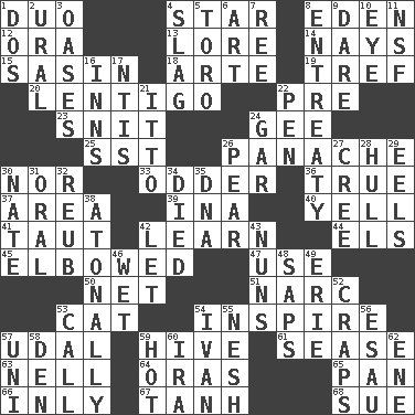 ACROSS 1. Superhero pair 4. Play the lead 8. Genesis locale 12. Mouth or opening 13. Old wives' tales, e.g. 14. Negative votes 15. Indian antelope 18. Johnson of "Laugh-In" 19. Unclean, religiously 20. Small, flat, pigmented spot on the skin 22. Before (prefix) 23. In a ____ (agitated or irritated) 24. Unit of force equal to gravity 25. Fast jet (abbr.) 26. Flamboyance 30. Not either 33. More peculiar 36. Loyal 37. Type of rug 39. _ tizzy (2 wds.) 40. Shout 41. Tense 42. Acquire or gain knowledge or skills 44. Raised railways 45. Shoved, as through a crowd 47. Purpose 50. Fish or hair follower 51. Drug cop 53. Feline 54. Stimulate to action 57. Hereditary estate 59. Hub of activity 61. Gospel singer Marvin 63. 1994 drama film starring Jodie Foster 64. Mouths or openings 65. Baking dish 66. Inwardly 67. Hyperbolic tangent 68. Institute legal proceedings DOWN 1. Two (Sp.) 2. Mountain range 3. Fertile tracts in a desert 4. Volcanic refuse 5. "Corrida" creature 6. Tate display 7. To sift 8. Plea 9. Have the gumption 10. Sight organ 11. Science/research agcy. 16. Restaurants 17. Nuclear Threat Initiatives 21. "Tell ____ the Marines!" 22. Writing instrument 24. Slender fish 26. Lightbulb-shaped fruit 27. Algonquian 28. Frame or body of a ship 29. Snakelike fish 30. Nathan's nickname 31. Taken by mouth 32. Reuben's nickname 34. Passed on 35. Heredity factor (abbr.) 38. Lacking a tonal center or key 42. Allow 43. Religious women 46. Soggy 48. Plant excrements 49. 4th largest of the Great Lakes 52. Dice game 53. Give a ring to 54. _ the terrible 55. Delicate 56. He sold his birthright 57. Corn or form start 58. Lair 59. Being at a high temperature 60. Retirement account (abbr.) 62. Compass dir.