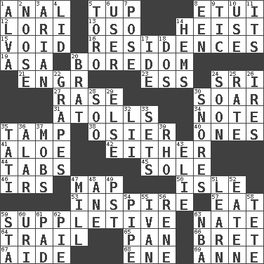 ACROSS 1. Of or related to the anus 5. Uncastrated adult male sheep 8. Needle holder 12. Australian parrot (variant) 13. Bear (Spanish) 14. Robbery 15. State of nonexistence 16. Dwellings 19. White ___ sheet 20. Mood resulting from idleness 21. Engineer (abbr.) 23. Double-curved letter 24. _ Lanka 27. To erase 30. Fly high 31. Ringlike coral islands and reefs 34. Observe 35. Pack (down) 38. Flexible twig of a willow tree 40. Washington bills 41. Medicinal plant 42. One or the other of two 44. Bar bills 45. Flatfish 46. Big collection agency 47. Atlas unit 50. Small island 53. Motivate 57. Consume 59. Supplying deficiencies 63. Nathan's nickname 64. Get behind 65. Baking dish 66. Cy Young winner Saberhagen 67. Assistant 68. Compass dir. 69. Queen of England 1702-14 DOWN 1. Inventor's middle name 2. Trap for birds or small mammals 3. Believer in; advocate of (suffix) 4. Hat (slang) 5. "Corrida" creature 6. One who makes use of a thing 7. Introduce or present, as a question 8. Car or cant ending 9. Nervous spasm 10. Purpose 11. It is 14. Cloth borders 17. Binary compound 18. Two (Sp.) 20. Naughty child 22. Raisin fruits 24. Within a short period 25. Assign a rank or rating to 26. Angers 28. "Barney Miller" actor Jack 29. Otherwise 30. Sounds asleep 32. Cards in a Roman deck? 33. Arranges properly for use 35. Jacques of French films 36. Having or resembling wings 37. Disorderly crowds 39. 17th letter of the Greek alphabet 43. Writer Wiesel 47. Place where flour is made 48. A saturated hydrocarbon 49. Pacific Standard Time (abbr.) 51. Memorize 52. Eroded 54. Corncob 55. "Terrible" tsar 56. French philosopher Descartes 58. False hair 59. R.R. building 60. RI univ. 61. Groovy apt. 62. Sliced dessert 63. Basketball assoc.