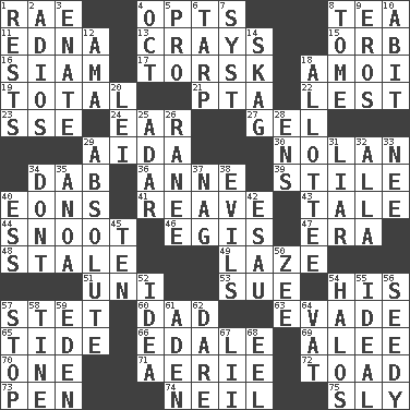 ACROSS 1. Actress Charlotte 4. Chooses 8. Beverage made from leaves 11. Pulitzer Prize-winning author Ferber 13. Trading vessels 15. Globe 16. Thailand, formerly 17. Cod relative 18. Mine, in Marseilles 19. Add up to 21. Parent Teacher Association (abbr.) 22. For fear that 23. Compass dir. 24. Ewer handle 27. Set 29. Opera by Verdi 30. Pitcher Ryan 34. Small moist lump or mass 36. Singer Murray 39. Vertical member of a panel or frame 40. Immeasurably long periods of time 41. Break or tear apart 43. Falsehood 44. Snob 46. The front part of a cuirass 47. Epoch 48. Showing deterioration from age 49. Goldbrick 51. Corn or form start 53. Institute legal proceedings 54. Part of HMS, perhaps 57. Proofreading order 60. June honoree 63. Dodge 65. Periodic rise and fall of the sea level 66. Peak District village in England 69. Toward shelter 70. Single 71. Nest on high 72. Frog relative 73. Writing instrument 74. Famous astronaut Armstrong 75. Cunning DOWN 1. Musical pauses 2. Goodbye (Sp.) 3. Related on the mother's side 4. Sep. follower 5. Adept person 6. Canvas cover 7. System (abbr.) 8. Heavy book 9. Greek god of love 10. "This won't hurt ____!" 12. Wet nurse (var.) 14. Heroin 18. One to whom something is allotted 20. Luau accessory 25. The sixth month of the Jewish calendar 26. Indian princess (variant) 28. Followers of ems 29. Utter; complete 31. One who doesn't tell the truth 32. Silent film actress Nazimova 33. Born 34. Do not 35. Small Philippine buffalo 37. Tired old horse 38. Vices 40. Curvy letter 42. He sold his birthright 45. Nine, plus one 50. Last letter of the English alphabet 52. The content of cognition 54. Auras 55. Perfect 56. Shabby and untidy 57. Obstruct or block passage 58. Prong on a fork 59. Paradise 61. Arabian gulf 62. Have the gumption 64. Large container 67. Cards in a Roman deck? 68. Snakelike fish