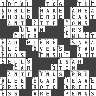 ACROSS 1. Perfect 6. Coat; cloak 9. Definite Article 12. Having high moral qualities 13. Cause to be 14. Type of rug 15. Hold, grip (Informal) 16. One of the Great Lakes 17. Patter 18. Cuckoo 19. Quote 20. Charged particles 21. ____ Bator 23. Big collection agency 24. Arab leader 25. An arm off of a larger body of water 28. Possessed 30. Military trainee 34. "Two Mules for Sister ____" 35. Biblical high priest 36. Baking chambers 38. The 19th letter of the Greek alphabet 39. Disorderly crowds 41. Take place subsequently 43. Baseball player Mel 44. Makes a sale 46. Austrian river, tributary to the Danube 48. Ewer handle 49. A distinct part 50. Opposed to 51. Restaurants 53. Adept person 56. Toward shelter 57. Mild oath 58. Break or tear apart 60. Global Positioning Systems (abbr.) 61. Printing process, for short 62. Satellite of Uranus 63. Curvy letter 64. "We ___ not amused" (Victoria) 65. Actor Sean's family DOWN 1. _ tizzy (2 wds.) 2. Capital of the state of Qatar 3. Inky black, to poets 4. Plant genus of onion and garlic 5. Directed 6. Small pie 7. Migrant worker of the '30s 8. Unit of force equal to gravity 9. Interpreter 10. Coop moms 11. Erode 13. Chow _ 14. Oak nuts 19. Monte _, Las Vegas Hotel/Casino 20. One more than two 22. Mouth edge 24. The property of being fit to eat 26. Part of Q.E.F. 27. Tense 28. Equivocates 29. Medicinal plant 31. First lady 32. Benjamin's nick name 33. Followers of ems 37. Sets of matching outer garments 40. Chalkboards 42. Compass dir. 45. Indian title of respect (Mr.) 47. Electrical Unit 49. Southeast Asian peninsula 50. High mountains 51. Russian composer Stravinsky 52. Nathan's nickname 54. Water falling in drops from the sky 55. Baking chamber 56. Personal question 57. Epoch 58. Reproach for some lapse or misdeed 59. Raised railways