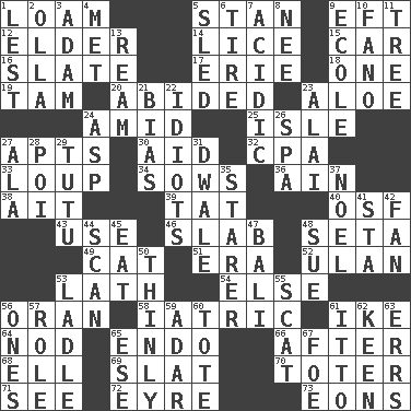ACROSS 1. Rich soil 5. Comedian Laurel of Laurel & Hardy 9. Bank Draft (abbr.) 12. A person who is older than you are 14. Louse (plural) 15. Automobile 16. Schedule 17. One of the Great Lakes 18. Single 19. Scottish cap 20. Stayed 23. Medicinal plant 24. Among 25. Small island 27. Flats, for short 30. Assist 32. Tax preparer (abbr.) 33. Central Nebraska county 34. Sty mamas 36. The 18th letter of the Arabic alphabet 38. Small island 39. Make lace 40. Order of Saint Francis (abbr.) 43. Purpose 46. Thick slice 48. Stalk of a moss capsule 49. Feline 51. Period 52. ____ Bator 53. Thin strip of wood or metal 54. Otherwise 56. NW Algerian seaport 58. Of or pertaining to medicine 61. Mamie's mate 64. Allow head to fall sleepily 65. Inside; within (prefix) 66. Following 68. Pipe bend 69. Narrow board 70. Carrier 71. Perceive with the eye 72. Jane of fiction 73. Immeasurably long periods of time DOWN 1. For fear that 2. Water jar 3. First man 4. Was introduced to 5. Downhill vehicle 6. Become fatigued 7. Being or containing an acid 8. Born 9. Learning spot: Fr. 10. Papal veil 11. Family _ (genealogy) 13. 480, 500 or 516 sheets of paper 21. Prejudice 22. Foolish or stupid persons 23. Jai _ 24. Cleo's killer 26. Health resort 27. According to 28. Luau course 29. Ballerina skirt 31. A sleeping potion; an opiate (poet.) 35. A viewer who gazes fixedly 37. Christmas carol 41. R.R. building 42. Air blower 44. Examine minutely or intensely 45. Consume 47. Indonesian resort city 48. Institute legal proceedings 50. Without thickness 53. Dipping utensil 55. Leave at once 56. Singles 57. Hero or heavy, e.g. 59. The sixth month of the Jewish calendar 60. Carryall 61. "Tell ____ the Marines!" 62. Peachy ____! 63. Blunders 65. Compass dir. 67. Enemy