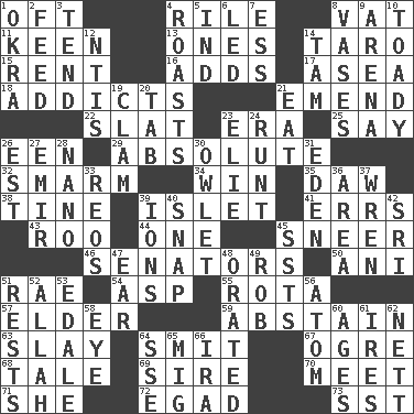 ACROSS 1. Often (poetically) 4. Cause heat under the collar 8. Large container 11. Peachy ____! 13. Singles 14. Edible starchy tuberous root 15. Monthly bill 16. Does sums 17. Toward the sea 18. Inveterate users 21. Make improvements or corrections to 22. Narrow board 23. Period 25. Declare 26. Car or cant ending 29. Utter; complete 32. Excessive but superficial compliments 34. Victory 35. Simpleton 38. Prong on a fork 39. Small island 41. Blunders 43. Friend of Pooh 44. Single 45. Scornful expression 46. Elected representatives 50. Black tropical American cuckoo 51. Actress Charlotte 54. Cleo's killer 55. Roll call or roster of names 57. A person who is older than you are 59. Refrain by choice 63. Kill 64. Stricken, poetically 67. Legendary monster 68. Falsehood 69. Title for a man of rank and authority 70. Confront 71. A female animal or person 72. Mild oath 73. Fast jet (abbr.) DOWN 1. Gumbo ingredient 2. Nourish 3. Be inclined (to) 4. Ridicules or criticizes harshly 5. Indiana (abbr.) 6. Directed 7. Double-curved letter 8. Flower holders 9. Sports stadium 10. Sycophant 12. Nuclear Threat Initiatives 14. Scottish cap 19. Burrowing marine mollusk 20. Keyboard key 21. Consume 23. Writer Wiesel 24. Undersized animal 26. Eastern Standard Time (abbr.) 27. Independent ruler or chieftain 28. Billionth: prefix 30. A small or young owl 31. Paradise 33. Vintage cars 36. Length times width 37. Songbird 39. Charged particles 40. Fastener 42. Indian title of respect (Mr.) 45. Fast planes 47. Hearing organ 48. Declaimed 49. Director Reiner 51. Musical pauses 52. Assad's deity 53. Peak District village in England 56. Tiny particle 58. Sight organ 60. Ripens 61. Angers 62. Remaining after all deductions 64. Compass dir. 65. Russian fighter aircraft 66. Retirement account (abbr.)