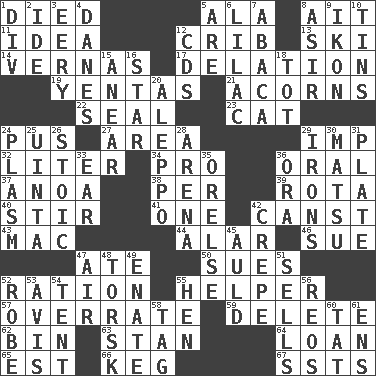 ACROSS 1. Passed on 5. Wing 8. Small island 11. It may be bright or harebrained 12. Baby bed with high sides 13. What Jean-Claude Killy likes to do 14. Actresses Bloom and Felton 17. Conveyance 19. Gossips 21. Oak nuts 22. Lick closed 23. Feline 24. Festering 27. Type of rug 29. Naughty child 32. 61 cubic inches 34. Adept person 36. Spoken 37. Small Philippine buffalo 38. For each 39. Round or rotation of duties 40. Disorderly outburst 41. Single 42. 2nd pers. sing. pres. of can (arch.) 43. Apple computer (short form) 44. Having or resembling wings 46. Take to court 47. Had dinner 50. Institutes legal proceedings 52. Food allowance for one day 55. Aide 57. Make much ado about nothing 59. Erase 62. Storage container 63. Comedian Laurel of Laurel & Hardy 64. Grant temporary use of 65. Eastern Standard Time (abbr.) 66. Barrel 67. Fast planes DOWN 1. HTML Container Element 2. Binary compound 3. Suggestive of the supernatural 4. Natives or inhabitants of Denmark 5. "We ___ not amused" (Victoria) 6. Pale purple color 7. Phillipine bananalike plant 8. SW Saudi Arabia district 9. Picture 10. Metal containers 12. Music discs 15. Approach 16. Play the lead 18. Small child 20. City in Syria 24. Suffix with ecto or cyto 25. National forest in Provo, Utah 26. Unemotional 28. Sports stadium 29. Metal shackles 30. Taiwanese island in East China Sea 31. Food holder 33. Hearing organ 35. Threatening words 36. Mouth or opening 42. Streamer paper 45. Old (Scot.) 47. Atmosphere 48. Cod relative 49. Related on the mother's side 51. Exchanges for money 52. Loose flowing garment 53. Advice 54. Portable shelter 55. Layer 56. Vintage cars 58. Label 60. Make lace 61. Followers of ems