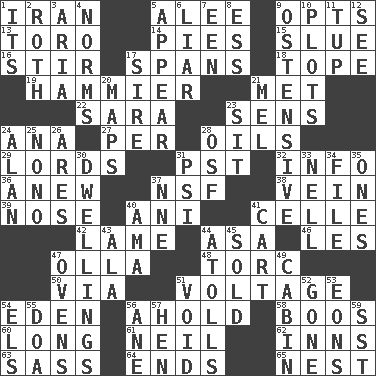 ACROSS 1. SW Asia republic 5. Toward shelter 9. Elects 13. "Corrida" creature 14. Sliced desserts 15. Turn sharply 16. Disorderly outburst 17. Connects, as a bridge 18. Drink excessively 19. More given to overacting 21. Was introduced to 22. "Two Mules for Sister ____" 23. Elected reps. 24. Santa ___, CA 27. For each 28. Petroleums 29. Domineers 31. Pacific Standard Time (abbr.) 32. Information 36. Afresh 37. Science/research agcy. 38. Distinctive style or manner 39. Olfactory organ 40. Black tropical American cuckoo 41. Cell (Danish) 42. Unable to walk 44. White ___ sheet 46. French article 47. Water jar 48. Torque (variant) 50. By way of 51. Electrical Measurement 54. Genesis locale 56. Hold, grip (Informal) 58. Expressions of contempt or scorn 60. Yearn 61. Famous astronaut Armstrong 62. Lodging establishments 63. Backtalk 64. Extremities 65. Egg locale DOWN 1. It is 2. Writer of Portnoy's Complaint (1969) 3. Operatic vocal solo 4. Typical models 5. Seem 6. One who doesn't tell the truth 7. Car or cant ending 8. Double-curved letter 9. Clearly or manifestly demonstrative 10. Secret plans 11. Uncastrated adult male sheep 12. Observe 17. Title for a man of rank and authority 20. Atlas contents 21. Cartoonist voice _ Blanc 23. Be seated 24. Actor Alda or Thicke 25. Words to Nanette 26. Ancient Greek god of war 28. Order of Saint Francis (abbr.) 30. Homes 31. 23rd letter of the Greek alphabet 33. 1994 drama film starring Jodie Foster 34. Do some clerical work 35. Singles 37. Compass dir. 40. Nursemaid (var.) 41. Draw slowly or heavily 43. In the manner of 44. Ringlike coral islands and reefs 45. Disposed of to a purchaser 47. Baking chambers 49. Small house or cottage 51. Nothingness 52. Went 53. Immeasurably long periods of time 54. Raised railways 55. ___ good deed 56. A saturated hydrocarbon 57. Layer 59. Fast jet (abbr.)