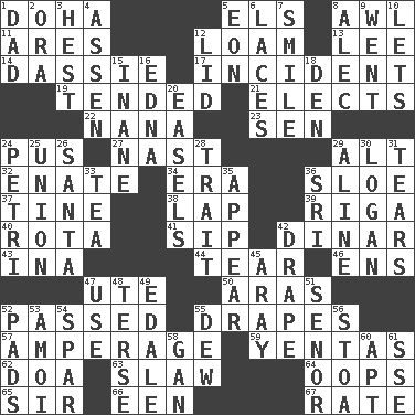 ACROSS 1. Capital of the state of Qatar 5. Raised railways 8. Leather borer 11. Ancient Greek god of war 12. Rich soil 13. Area sheltered from the wind 14. Hyrax 17. Happening 19. Watched over 21. Chooses 22. Grandmother 23. Elected rep. 24. Fluid product of inflammation 27. Political cartoonist Thomas 29. Keyboard modifier key 32. Related on the mother's side 34. Period 36. A type of plum 37. Prong on a fork 38. Pet locale 39. Port city in Latvia 40. Round or rotation of duties 41. Small drink 42. Middle Eastern gold or silver currency 43. _ tizzy (2 wds.) 44. Lacerate 46. Followers of ems 47. Shoshoni 50. Caspian sea tributary 52. Went by 55. Window treatments 57. Electrical Measurement 59. Gossips 62. ___ good deed 63. Cole _ (cabbage dish) 64. I made a mistake 65. Title for a knight 66. Car or cant ending 67. Assign a rank or rating to DOWN 1. Male parent 2. Mouth or opening 3. Behest 4. NE Netherlands city 5. A really long time 6. Shoestrings 7. Grin 8. Actor Baldwin 9. Gone 10. Allows 12. Flaplike covering 15. Lacking in sense or substance 16. Pulitzer Prize-winning author Ferber 18. Lair 20. Artist's stands 24. _ dish (used to culture cells) 25. The state of being joined or united 26. Before Barbara or Clara 28. Distinguishing feature 29. Place in a line 30. Utah city north of Ogden 31. Separates forcefully 33. Beverage made from leaves 35. Seem 36. Indian title of respect (Mr.) 42. Window treatment 45. Like ___ of sunshine 47. Purpose 48. Laconic 49. Peak District village in England 51. Sir (Sp.) 52. Groovy apts. 53. Mine, in Marseilles 54. Practice fight 55. Morning condensation 56. Portico 58. Separate the seeds from cotton 60. Fitting 61. Compass dir.