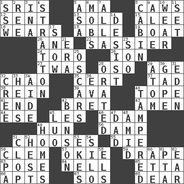 ACROSS 1. Indian titles of respect 5. Housemaid (var.) 8. Crow sounds 12. Transmitted 13. Disposed of to a purchaser 15. Toward shelter 16. Erodes 18. Competent 19. Water vessel 20. One (Scot) 22. More disrespectful 24. "Corrida" creature 26. Electrically charged atom 27. It was, poetically 28. Bear (Spanish) 29. Personal question 32. US Secretary of Labor Elaine L. _ 35. Sure thing 37. Bit 38. It's straight from the horse's mouth 39. Actress Gardner 40. Drink excessively 41. Conclusion 42. Cy Young winner Saberhagen 43. So be it 44. Compass dir. 45. French article 46. Dutch treat 49. Attila the _ 50. Moist 51. Opts 55. Pass on 56. To starve (Brit.) 57. Migrant worker of the '30s 59. Window treatment 63. Introduce or present, as a question 64. 1994 drama film starring Jodie Foster 65. Singer James 66. Flats, for short 67. Mayday 68. Letter starter DOWN 1. Compass dir. 2. Portuguese money of account (variant) 3. _ tizzy (2 wds.) 4. Ski resort town in Vermont 5. White ___ sheet 6. Crowds into 7. Silent film actress Nazimova 8. Small house or cottage 9. Medicinal plant 10. Erode 11. Put into a specified state 14. Stop 17. Overwhelm 21. Epoch 23. "Barney Miller" actor Jack 25. Motion picture awards 28. Spoke pompously 29. Smallest unit of an element 30. Open wide 31. Paradise 32. Algonquian 33. Coop moms 34. Assistant 36. Night before a holiday 40. ________ with (broke a safety seal) 42. Gillaume's butler role 45. Nilotic language 47. June honoree 48. Among 49. Dwellings 51. Hoof sound 52. Behest 53. Supplements with great effort 54. Grain storage tower 56. Numbers guy (abbr.) 58. Raised railways 60. Had dinner 61. Parent Teacher Assoc. 62. Hearing organ