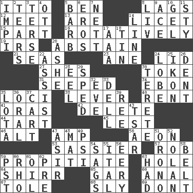 ACROSS 1. "Tell ____ the Marines!" 5. Benjamin's nick name 8. Falls behind 12. Rendezvous 13. "We ___ not amused" (Victoria) 14. It is permitted: Lat. 15. Component 16. Rotating or pertaining to rotation 19. Big collection agency 20. Refrain by choice 21. Oceans 23. A saturated hydrocarbon 24. Flaplike covering 27. "______ My Girl" (Turtles hit) 30. Puff or smoke 31. Oozed 34. Inky black, to poets 35. Event scenes 38. Crowbar 40. Monthly bill 41. Mouths or openings 42. Keyboard key 44. Small pie 45. For fear that 46. The first octave above the treble staff 47. Electrical Unit 50. Age 53. More lively and spirited 57. Director Reiner 59. Conciliate 63. Hollow 64. Bake eggs in their shells 65. Slender fish 66. Of or related to the anus 67. Lacquered or enameled metalware 68. Mischievous 69. Do not DOWN 1. Body of Kaffir warriors 2. Rends 3. Laconic 4. Baseball player Mel 5. Sharp remark 6. Greek god of love 7. Remaining after all deductions 8. 54 in ancient Rome 9. Adept person 10. Set 11. Filthy place 14. Actor's bit 17. Auto club (abbr.) 18. Shallow baking pan 20. American tennis player Robert 22. Aid 24. Ear part 25. Image 26. Incision 28. Snakelike fish 29. Broke a traffic law 30. Cylindrical with tapered ends 32. First lady 33. Small valley 35. Globular water bottle used in Asia 36. Spoken 37. Haul 39. To sift 43. Russian ruler of old 47. SW Saudi Arabia district 48. Floor protector 49. Air pressure measure (abbr.) 51. U. of Maine site 52. Pitcher Ryan 54. Sinks 55. Slanted text style (abbr.) 56. Suggestive of the supernatural 58. Waist strap 59. Pacific Standard Time (abbr.) 60. 17th letter of the Greek alphabet 61. Petroleum 62. Before (prefix) 63. Possessed