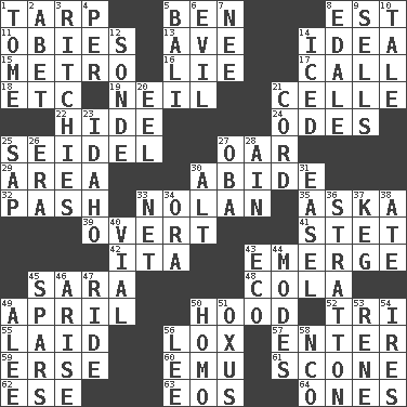 ACROSS 1. Canvas cover 5. Benjamin's nick name 8. Eastern Standard Time (abbr.) 11. Off-Broadway awards 13. "___ Maria" 14. The main thing one is thinking about 15. Paris' subway 16. Untruth 17. Give a ring to 18. And so on (abbr.) 19. Famous astronaut Armstrong 21. Cell (Danish) 22. Flintstone garb 24. Lyric poems 25. Beer mug 27. Rowing implement 29. Type of rug 30. Tolerate 32. Romantic infatuation 33. Pitcher Ryan 35. "____ silly question..." 39. Unconcealed 41. Proofreading order 42. Call ___ day 43. Develop 45. "Two Mules for Sister ____" 48. Root beer relative 49. Showery time 50. Parka part 52. Three (prefix) 55. Put down 56. Brine-cured salmon 57. Keyboard key 59. Celtic language 60. Australian flightless bird 61. Biscuitlike quick bread 62. Compass dir. 63. Greek goddess of the dawn 64. Washington bills DOWN 1. Heavy book 2. Collude with 3. Actors Guy, Robert Welles, and Clint 4. For each 5. Indonesian resort city 6. Tending to cause great harm 7. Born 8. Peak District village in England 9. Exchanges for money 10. Lie 12. Message 14. On the rocks 20. Snakelike fish 21. Drawstring 23. Potato state 25. Plant excrement 26. Epoch 27. Chief or king in Benin or Nigeria 28. The 18th letter of the Arabic alphabet 30. Keyboard modifier key 31. Artist's stand 33. Fish or hair follower 34. Mouth or opening 36. Ski resort town in Vermont 37. Cask 38. Had dinner 40. Small bottle 43. Environmental prefix 44. Methods 45. Practice fights 46. Originate 47. Travel on an animal 49. Toward shelter 50. Same (prefix) 51. Amu Darya 53. French philosopher Descartes 54. Angers 56. Area sheltered from the wind 58. Non-commissioned officer (abbr.)