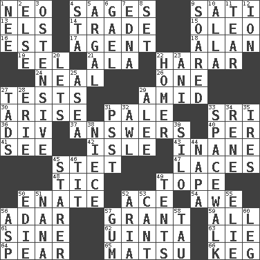ACROSS 1. Modern: prefix 4. Gurus 9. Suttee (variant) 13. Raised railways 14. Barter 15. Butter sub 16. Eastern Standard Time (abbr.) 17. Rep 18. ____ Jay Lerner 19. Snakelike fish 21. In the manner of 22. Ethiopian city, capital of Harari 24. Anneal 26. Single 27. Trials 29. Among 30. Originate 31. Diluted with white 33. Indian title of respect (Mr.) 36. HTML Container Element 37. Responds (to) 40. For each 41. Observe 42. Small island 43. Lacking in sense or substance 45. Proofreading order 47. Shoestrings 48. Nervous spasm 49. Drink excessively 50. Related on the mother's side 52. Adept person 54. Deep reverence 56. The sixth month of the Jewish calendar 57. Monetary aid 59. Everything 61. Trig term 62. National forest in Provo, Utah 63. Untruth 64. Lightbulb-shaped fruit 65. Taiwanese island in East China Sea 66. Cask DOWN 1. Born 2. Otherwise 3. Clearly or manifestly demonstrative 4. R.R. building 5. Therefore, facetiously 6. Highlander 7. Pulitzer Prize-winning author Ferber 8. Put into a specified state 9. Flew 10. Silent film actress Nazimova 11. Rend 12. Electrically charged atom 20. Allows 22. Baseball hit which scores a run 23. Black tropical American cuckoo 25. Toward the sea 27. Small amounts or degrees 28. 4th largest of the Great Lakes 29. Toward shelter 31. Inconspicuous attention getter 32. Leather borer 33. High altitude stroll 34. French philosopher Descartes 35. Angers 38. Sibling's daughter 39. Grain storage tower 44. California wine valley 45. A viewer who gazes fixedly 46. Teat (slang) 49. Portable shelters 50. Singer Brickell 51. Grandmother 52. Roberta Peters solo 53. Patter 55. Writer Wiesel 56. Viper 57. Chewing product 58. The 19th letter of the Greek alphabet 60. Part of a journey