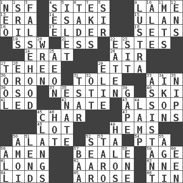 ACROSS 1. Overdraft (abbr.) 4. Locates 9. Unable to walk 13. Epoch 14. 1973 Nobel Price Winner (Physics) Leo 15. Uhlan (variant) 16. Petroleum 17. A person who is older than you are 18. Arranges properly for use 19. Compass dir. 21. Double-curved letter 22. _____ Park, CO 24. Part of Q.E.F. 26. Wind 27. Giggle 29. Singer James 30. U. of Maine site 31. Lacquered or enameled metalware 33. The 18th letter of the Arabic alphabet 36. Bear (Spanish) 37. Snuggling 40. What Jean-Claude Killy likes to do 41. Directed 42. Nathan's nickname 43. Columnist Joseph or Stewart 45. Burn to charcoal 47. Aches 48. Car dealer's back yard 49. Equivocates 50. Having winglike extensions 52. R.R. building 54. Parent Teacher Association (abbr.) 56. So be it 57. Memphis, Tenn. Street 59. Personal question 61. Having great length 62. Composer Copland 63. Compass dir. 64. Hats (slang) 65. Came up 66. Shallow baking pan DOWN 1. Modern: prefix 2. Indian titles of respect 3. It jiggles the polygraph 4. Observe 5. Small island 6. Small boys 7. Makes supply last 8. Title for a knight 9. A period of five years 10. Toward shelter 11. Floor coverings 12. Followers of ems 20. Songbird 22. Consumed 23. Be seated 25. Age 27. Implement 28. Celtic language 29. Writer Wiesel 31. Russian ruler of old 32. Baseball player Mel 33. Aide 34. Visual representation of an object 35. Cuts off 38. Maternal 39. Yawn 44. Desk light 45. Rigngs loudly 46. Being at a high temperature 49. Saint headwear 50. Mine, in Marseilles 51. Grant temporary use of 52. Dry up 53. Edible starchy tuberous root 55. Hindu god of fire 56. Everything 57. Sound made by sheep 58. Compass dir. 60. Car or cant ending