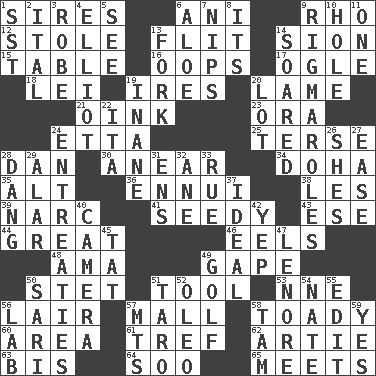 ACROSS 1. Founders of families 6. Black tropical American cuckoo 9. 17th letter of the Greek alphabet 12. Fur scarf 13. Sudden quick movement 14. The Jewish people; Israel 15. Eating place 16. I made a mistake 17. Stare at amorously 18. Luau accessory 19. Angers 20. Unable to walk 21. Pig sound 23. Mouth or opening 24. Singer James 25. Laconic 28. One of the 12 tribes of Israel 30. Approach 34. Capital of the state of Qatar 35. Keyboard modifier key 36. World-weariness 38. French article 39. Drug cop 41. Morally degraded 43. Compass dir. 44. Relatively large 46. Snakelike fish 48. Nanny (var.) 49. Open wide 50. Proofreading order 51. Utensil 53. Compass dir. 56. Den 57. Promenade 58. Sycophant 60. Length times width 61. Not kosher 62. Nick name for Arthur 63. Again 64. "Barney Miller" actor Jack 65. Confronts DOWN 1. Fast jet (abbr.) 2. Slanted text style (abbr.) 3. Loose flowing garment 4. American author Paul (1891-1958) 5. Observe 6. Medicinal plant 7. Cuts off 8. It is 9. Frustrating wastes of time 10. Hollow 11. Single 13. Tined utensil 14. Flew 19. Silly 20. Car dealer's back yard 22. Call ___ day 24. Pleas 26. "______ My Girl" (Turtles hit) 27. Relaxation 28. Mild oath, euphamism for damn 29. Having or resembling wings 31. Followers of ems 32. One (Scot) 33. Regret 37. Standard of perfection 40. Device for capturing images 42. Slangy assent 45. Make lace 47. Poe poem 49. _ course 50. Indian skirt 51. Edible starchy tuberous root 52. Margarine 54. Nathan's nickname 55. Prepare for publication 56. Experiment locale 57. Mountains (abbr.) 58. Scottish cap 59. Consenting reply