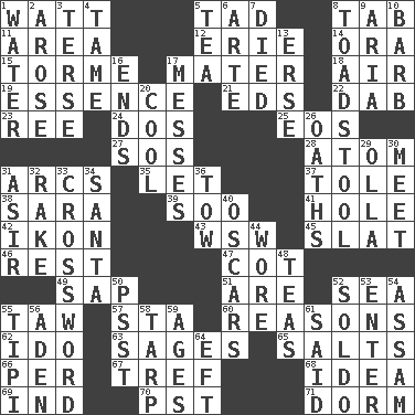 ACROSS 1. Electrical Unit 5. Small boy 8. Keyboard key 11. Type of rug 12. 4th largest of the Great Lakes 14. Mouth or opening 15. Singer Mel 17. Mother 18. Atmosphere 19. Gist 21. Begley and Asner 22. Pat or tap gently 23. To separate or throw off 24. Two (Sp.) 25. Greek goddess of the dawn 27. Distress signal 28. Smallest unit of an element 31. Arches 35. Allow 37. Lacquered or enameled metalware 38. "Two Mules for Sister ____" 39. "Barney Miller" actor Jack 41. Opening into or through something 42. Visual representation of an object 43. Compass dir. 45. Narrow board 46. Remainder 47. Small bed 49. Plant excrement 51. "We ___ not amused" (Victoria) 52. Ocean 55. The 23rd letter of the Hebrew alphabet 57. R.R. building 60. Thinks logically 62. Wedding promise 63. Gurus 65. Table seasonings 66. For each 67. Not kosher 68. The main thing one is thinking about 69. Working for oneself (abbr.) 70. Pacific Standard Time (abbr.) 71. Dormintory (informal) DOWN 1. Wetness 2. Came up 3. Laconic 4. Not wild 5. Afternoon social gathering 6. Johnson of "Laugh-In" 7. Passed on 8. Inedible or poisonous agaric 9. Roberta Peters solo 10. Sharp remark 13. Celtic language 16. Extremities 17. Makes clutter 20. Calm and collected 26. Curses 29. Spanish pot 30. Confront 31. SW Saudi Arabia district 32. Immoral or dissolute person 33. What you're doing now 34. Before Barbara or Clara 36. Pull behind 40. Motion picture awards 44. Had on 48. Afternoon social gatherings 50. Inconspicuous attention getter 52. Twentieth part of a lira 53. Keyboard key 54. Indian state 55. Native american tent (variation) 56. Arabian gulf 58. Canvas cover 59. Eras 61. Stated 64. Newt