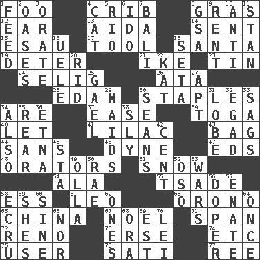 ACROSS 1. Egg _ yung 4. Baby bed with high sides 8. Pate de foie ____ 12. Ewer handle 13. Opera by Verdi 14. Transmitted 15. Son of Isaac 17. Utensil 18. Before Barbara or Clara 19. Prevent from occurring 21. Mamie's mate 23. Metal container 24. Former Milwaukee Brewers owner Bud 26. "One Day ___ Time" 28. Dutch treat 30. Paper fasteners 34. "We ___ not amused" (Victoria) 37. Relaxation 39. Ancient Roman robe 40. Allow 41. Pale purple color 43. Container for groceries 44. Without 46. Centimeter-gram-second unit of force 47. Begley and Asner 48. Speakers 51. Frozen precipitation 54. Wing 55. Sadhe (variant) 58. Curvy letter 61. Lion 63. U. of Maine site 65. Large country 67. Christmas carol 71. Connect, as a bridge 72. Western Nevada city 73. Celtic language 74. And so on (abbr.) 75. One who uses or employs something 76. Suttee (variant) 77. To separate or throw off DOWN 1. Nourish 2. Fertile tracts in a desert 3. Declaim 4. Feline 5. _ de Janeiro 6. Wedding promise 7. Indonesian resort city 8. Girls' org. (abbr.) 9. Monthly bill 10. Against 11. Comedian Laurel of Laurel & Hardy 16. Ubangi River tributary 18. Bristle 20. To free from 22. Krazy ___ of comics 25. Highlander 27. Fitting 29. Unmarried girls 30. Seines 31. Ear part 32. Mild oath 33. Sinks 34. In addition 35. Stern 36. Inactive volcano in Sicily 38. Stealthy 42. Penny 45. R.R. building 49. Water jar 50. Actress Charlotte 52. Bear (Spanish) 53. Armed conflicts 56. Drug addict 57. Related on the mother's side 58. Shade of tan 59. "______ My Girl" (Turtles hit) 60. Trig term 62. Washington bills 64. Single time 66. Or not 68. Mouth or opening 69. Eastern Standard Time (abbr.) 70. Flowery wreath