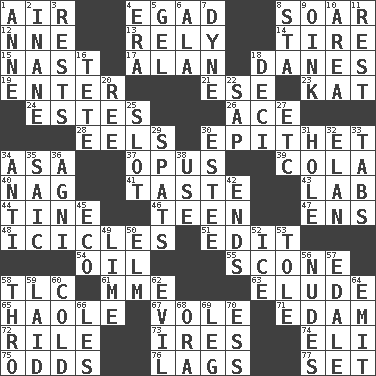 ACROSS 1. Atmosphere 4. Mild oath 8. Fly high 12. Compass dir. 13. Depend 14. Become fatigued 15. Political cartoonist Thomas 17. ____ Jay Lerner 18. Natives or inhabitants of Denmark 19. Keyboard key 21. Compass dir. 23. Krazy ___ of comics 24. _____ Park, CO 26. Adept person 28. Snakelike fish 30. Curse 34. White ___ sheet 37. Musical composition 39. Root beer relative 40. Tired old horse 41. Clothes sense 43. Experiment locale 44. Prong on a fork 46. Adolescent 47. Followers of ems 48. Winter's stalactites 51. Prepare for publication 54. Petroleum 55. Biscuitlike quick bread 58. Affectionate concern, for short 61. Madame (abbr.) 63. Dodge 65. White Person, in Hawaii 67. Grand slam 71. Dutch treat 72. Cause heat under the collar 73. Angers 74. Connecticut Ivy Leaguer 75. Probability 76. Straggles 77. Arrange properly for use DOWN 1. Singer Murray 2. Lacking in sense or substance 3. Musical pauses 4. Period 5. Set 6. Wing 7. Unit of force 8. R.R. building 9. Pig sound 10. Length times width 11. Respite 16. False hair 18. Tenth: prefix 20. Portuguese money of account (variant) 22. Plant excrement 25. Narrow, elongated depression 27. And so on (abbr.) 29. Arguments over trivial matters 30. First name in cosmetics 31. Hollow 32. Style 33. Bar bills 34. Against 35. Ketch in the Levant 36. Hindu god of fire 38. Purpose 42. Extremities 45. Environmental prefix 49. Welles in "The Third Man" 50. Shade tree 52. Frozen water 53. Lacquered or enameled metalware 56. Unclothed pictures 57. Peak District village in England 58. Through, poetically 59. Put down 60. Lacking warmth 62. Tending to cause great harm 64. Send forth 66. French article 68. Mouth or opening 69. Part of a journey 70. Double-curved letter