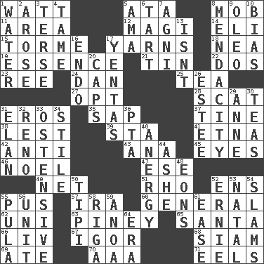 ACROSS 1. Electrical Unit 5. "One Day ___ Time" 8. Disorderly crowd 11. Type of rug 12. Wise men 14. Biblical high priest 15. Singer Mel 17. Tall tales 18. Teachers' org. 19. Core 21. Metal container 22. Two (Sp.) 23. To sift 24. One of the 12 tribes of Israel 25. Beverage made from leaves 27. Choose 28. Get outta here! 31. Greek god of love 35. Plant excrement 37. Prong on a fork 38. For fear that 39. R.R. building 41. Inactive volcano in Sicily 42. Opposed to 43. Santa ___, CA 45. Snake ____ (dice throw) 46. Christmas carol 47. Compass dir. 49. Fish or hair follower 51. 17th letter of the Greek alphabet 52. Followers of ems 55. Suppuration 57. Lyricist Gershwin 60. Commissioned military rank 62. Single; one (prefix) 63. Abounding in pines 65. Before Barbara or Clara 66. 54 in ancient Rome 67. Russian composer Stravinsky 68. Thailand, formerly 69. Had dinner 70. Auto club (abbr.) 71. Snakelike fish DOWN 1. Wetness 2. Came up 3. Laconic 4. Docile 5. Housemaid (var.) 6. Small pie 7. Hindu god of fire 8. Ananias' fault 9. Margarine 10. Prejudice 13. Is not 16. Inside; within (prefix) 17. Gossips 20. Balmoral and tarboosh 26. First name in cosmetics 29. Queen of England 1702-14 30. Beverages made from leaves 31. Style 32. Former U.S. Attorney General Janet 33. Clearly or manifestly demonstrative 34. Vertical member of a panel or frame 36. Parent Teacher Association (abbr.) 40. Disorder of the immune system 44. American tennis player Robert 48. Immeasurably long periods of time 50. Native american tent (variation) 52. Bert's buddy 53. Relating to or accompanying birth 54. Criticizes harshly 55. Monetary unit of Botswana 56. A single undivided whole 58. Capital of Latvia 59. Small Philippine buffalo 61. Comfort 64. Epoch